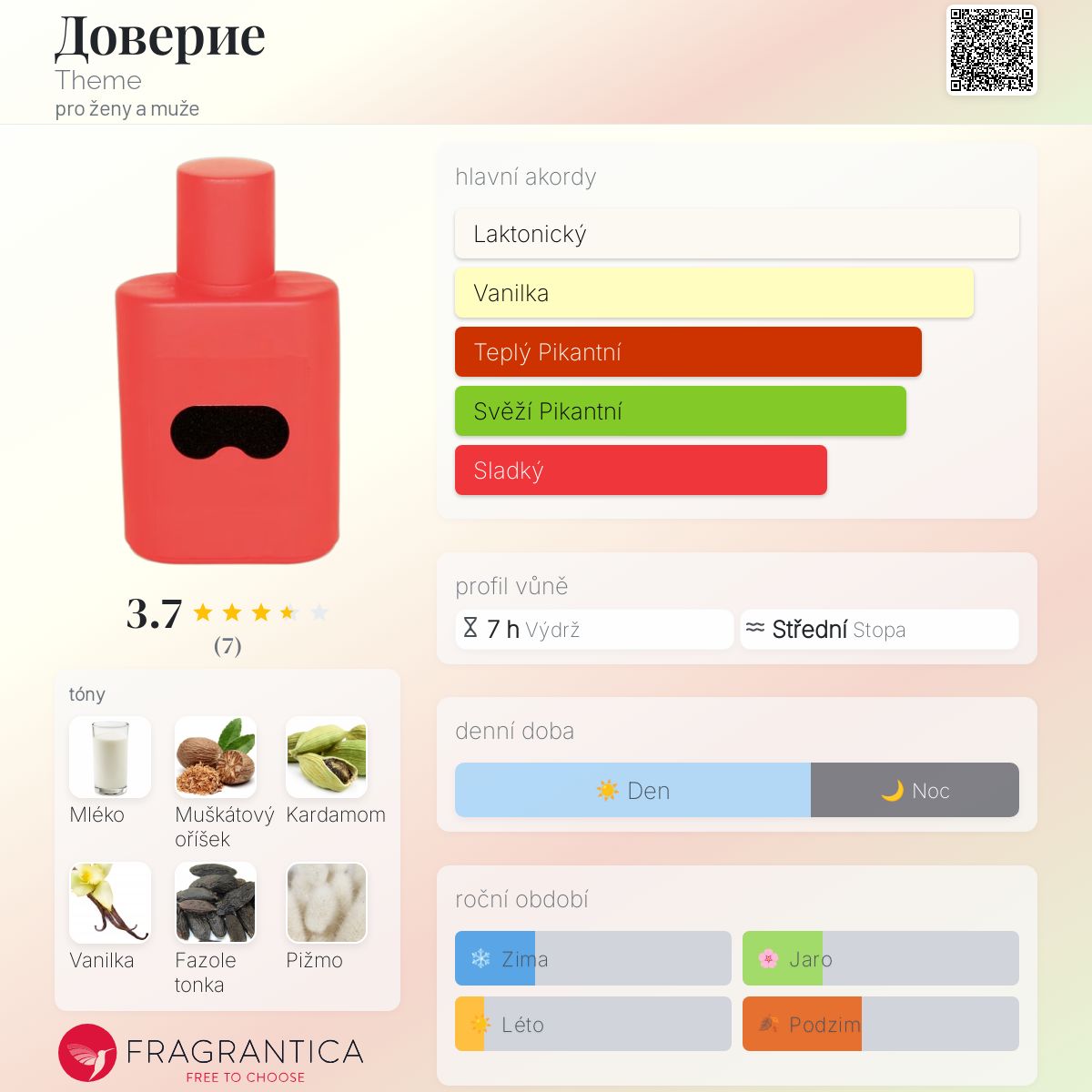 Доверие podle Theme je Orientální Vanilla vůně pro ženy a muže. Доверие byl/a uveden/a v roce 2019. "Nosem" za touto vůní je Elena Razumova. Vrchní tón je Kardamom ; střední tóny jsouMuškátový oříšek, Káva a Jasmín ; základní tóny jsou Mléko, Vanilka, Fazole tonka a Pižmo.