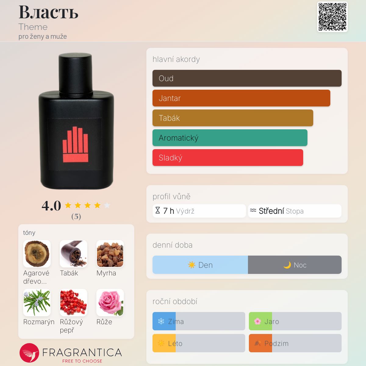 Власть podle Theme je Orientální Woody vůně pro ženy a muže. Власть byl/a uveden/a v roce 2019. "Nosem" za touto vůní je Elena Razumova. Vrchní tóny jsou Rozmarýn a Růžový pepř; střední tóny jsouRůže a Černý rybíz ; základní tóny jsou Agarové dřevo (oud), Tabák, Myrha, Kůže a Kadidlo.