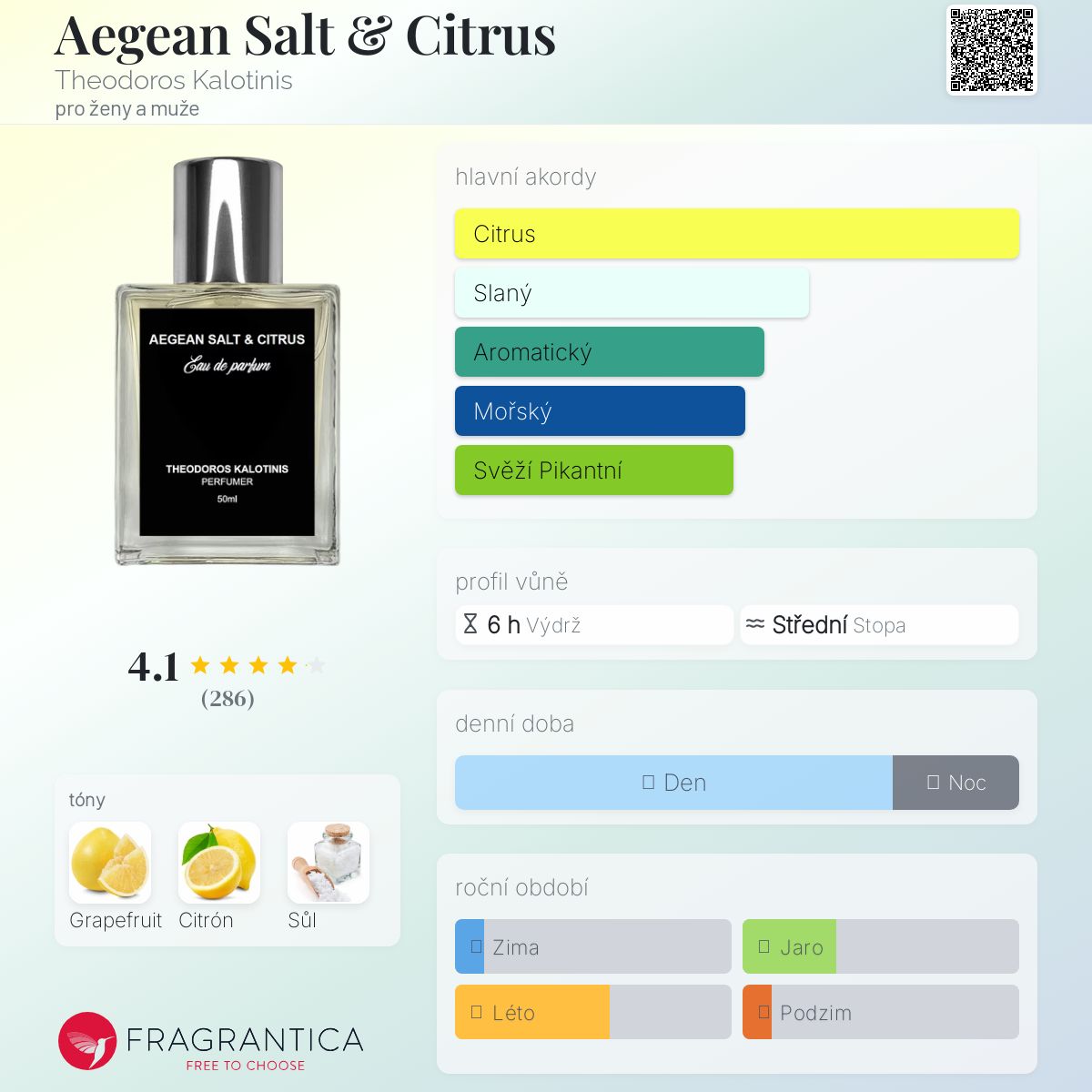 Aegean Salt & Citrus podle Theodoros Kalotinis je vůně pro ženy a muže. Aegean Salt & Citrus byl/a uveden/a v roce 2020. "Nosem" za touto vůní je Theodoros Kalotinis. Vrchní tón je Grapefruit ; střední tón jeCitrón ; základní tón je Sůl.