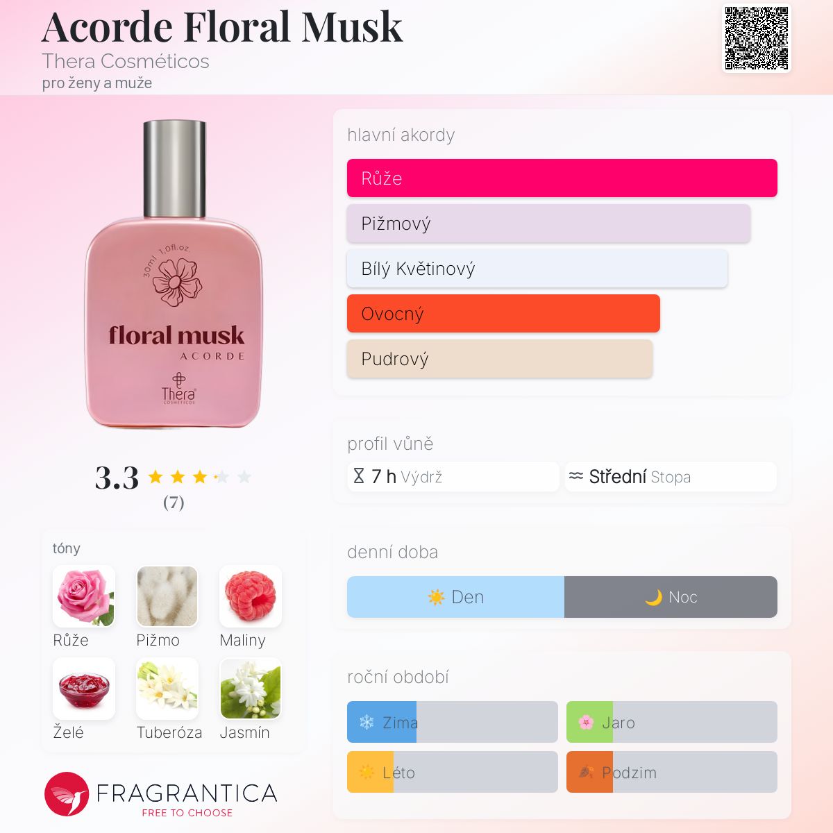 Acorde Floral Musk podle Thera Cosméticos je Floral Woody Musk vůně pro ženy a muže. Toto je nová vůně. Acorde Floral Musk byl/a uveden/a v roce 2024. Vrchní tóny jsou Maliny, Želé a Mandarinková kůra; střední tóny jsouRůže, Tuberóza, Jasmín, Bílé víno a Kosatec ; základní tóny jsou Pižmo, Ambra a Vanilka.