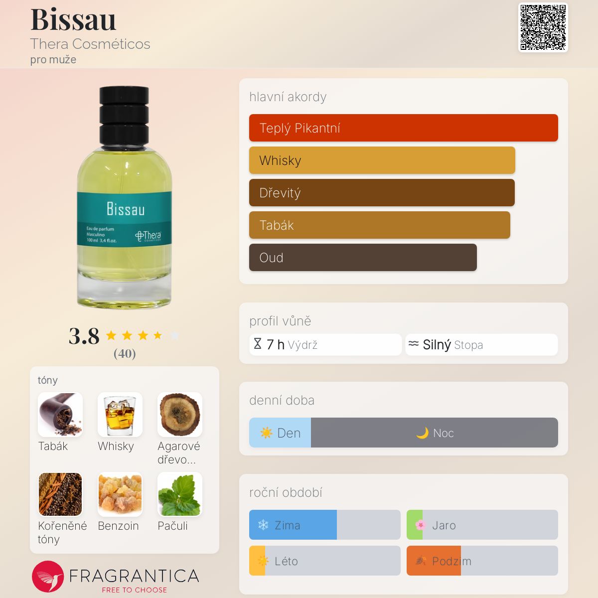 Bissau podle Thera Cosméticos je Woody Spicy vůně pro muže. Bissau byl/a uveden/a v roce 2017. "Nosem" za touto vůní je Mário Torri Neto. Vrchní tón je Whisky ; střední tóny jsouKoření a Skořice ; základní tóny jsou Tabák, Agarové dřevo (oud), Benzoin, Pačuli, Vanilka, Cedr a Fazole tonka.