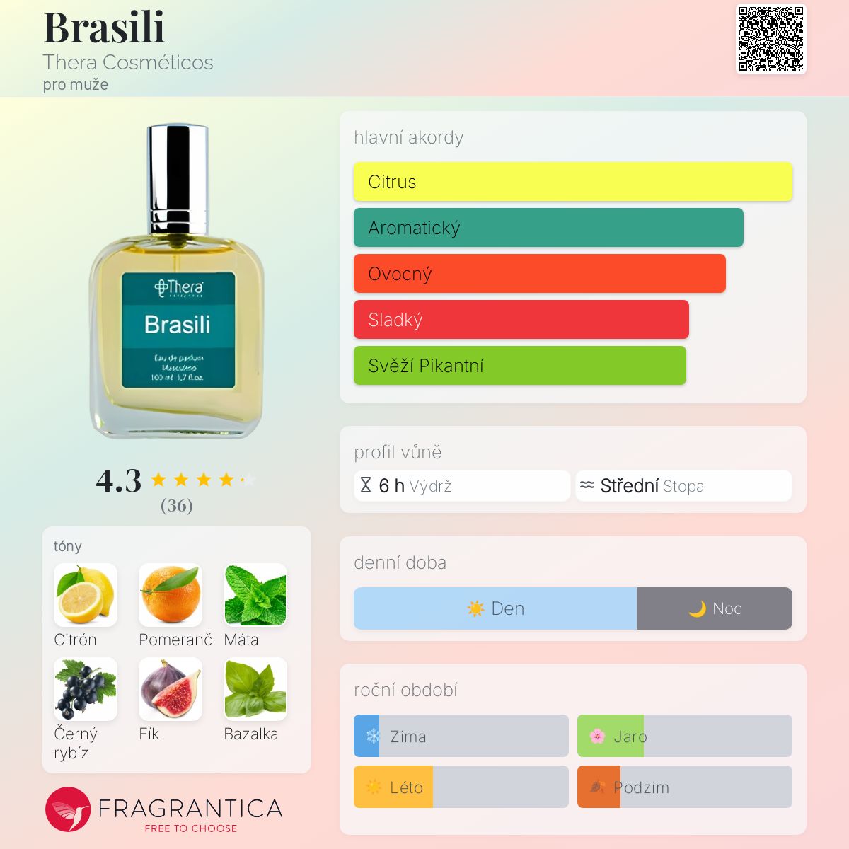 Brasili podle Thera Cosméticos je Aromatic Fruity vůně pro muže. Toto je nová vůně. Brasili byl/a uveden/a v roce 2025. Vrchní tóny jsou Sicilský citron, Pomeranč, Máta, Černý rybíz, Koriandr a Cedr; střední tóny jsouBazalka a Semena mrkve ; základní tóny jsou Fík, Datle a Ambrette (přírodní pižmo).