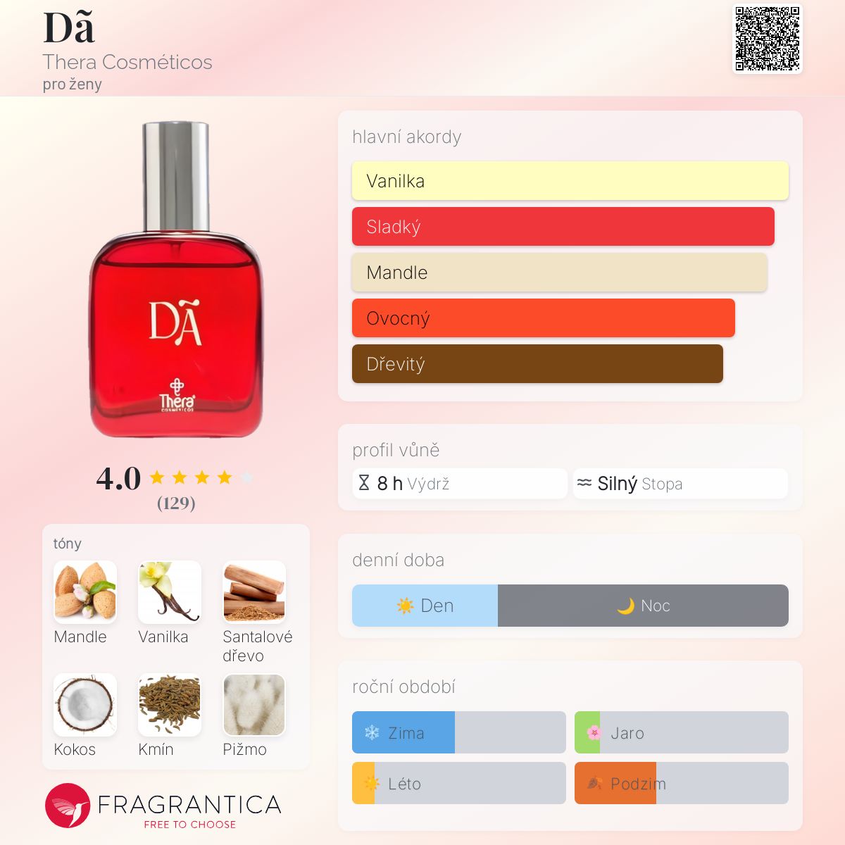 Dã podle Thera Cosméticos je Orientální Woody vůně pro ženy. Dã byl/a uveden/a v roce 2017. "Nosem" za touto vůní je Mário Torri Neto. Vrchní tóny jsou Kokos, Meruňka a Švestka; střední tóny jsouKmín, Tuberóza, Brazilské růžové dřevo, Jasmín a Konvalinka ; základní tóny jsou Mandle, Vanilka, Santalové dřevo a Pižmo.