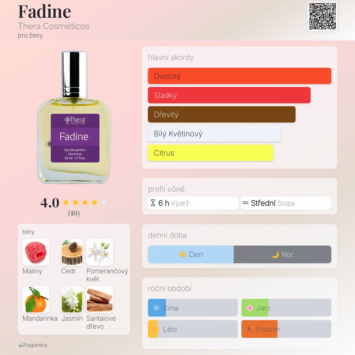 Fadine podle Thera Cosméticos je Floral Fruity vůně pro ženy. "Nosem" za touto vůní je Mário Torri Neto. Vrchní tóny jsou Maliny a Mandarinka; střední tóny jsouPomerančový květ a Jasmín ; základní tóny jsou Cedr a Santalové dřevo.