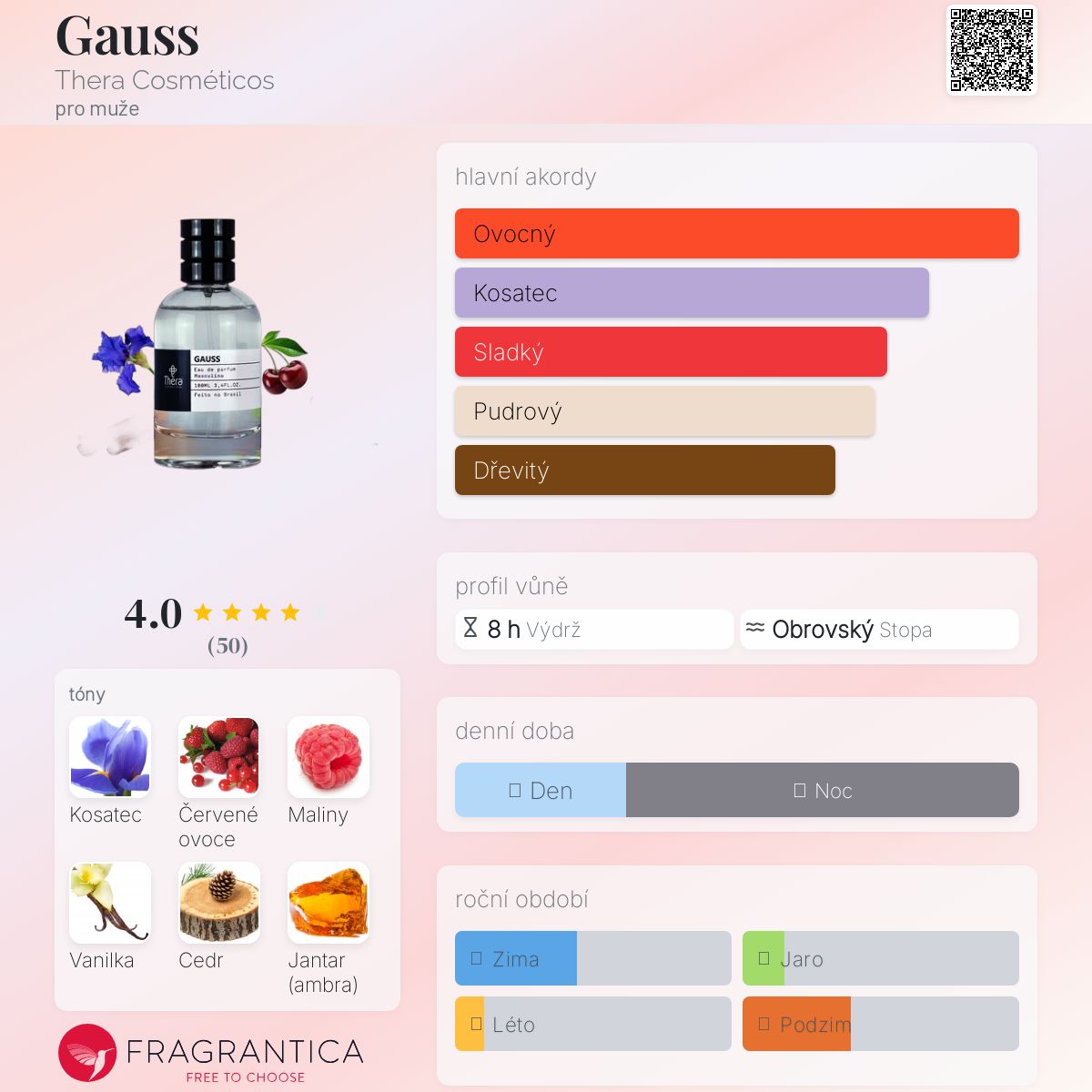 Gauss podle Thera Cosméticos je Woody Floral Musk vůně pro muže. Gauss byl/a uveden/a v roce 2018. "Nosem" za touto vůní je Mário Torri Neto. Vrchní tóny jsou Červené ovoce, Maliny a Černý rybíz; střední tóny jsouKosatec, Cedr, Skořice a Pačuli ; základní tóny jsou Vanilka, Jantar (ambra), Vetiver a Fazole tonka.