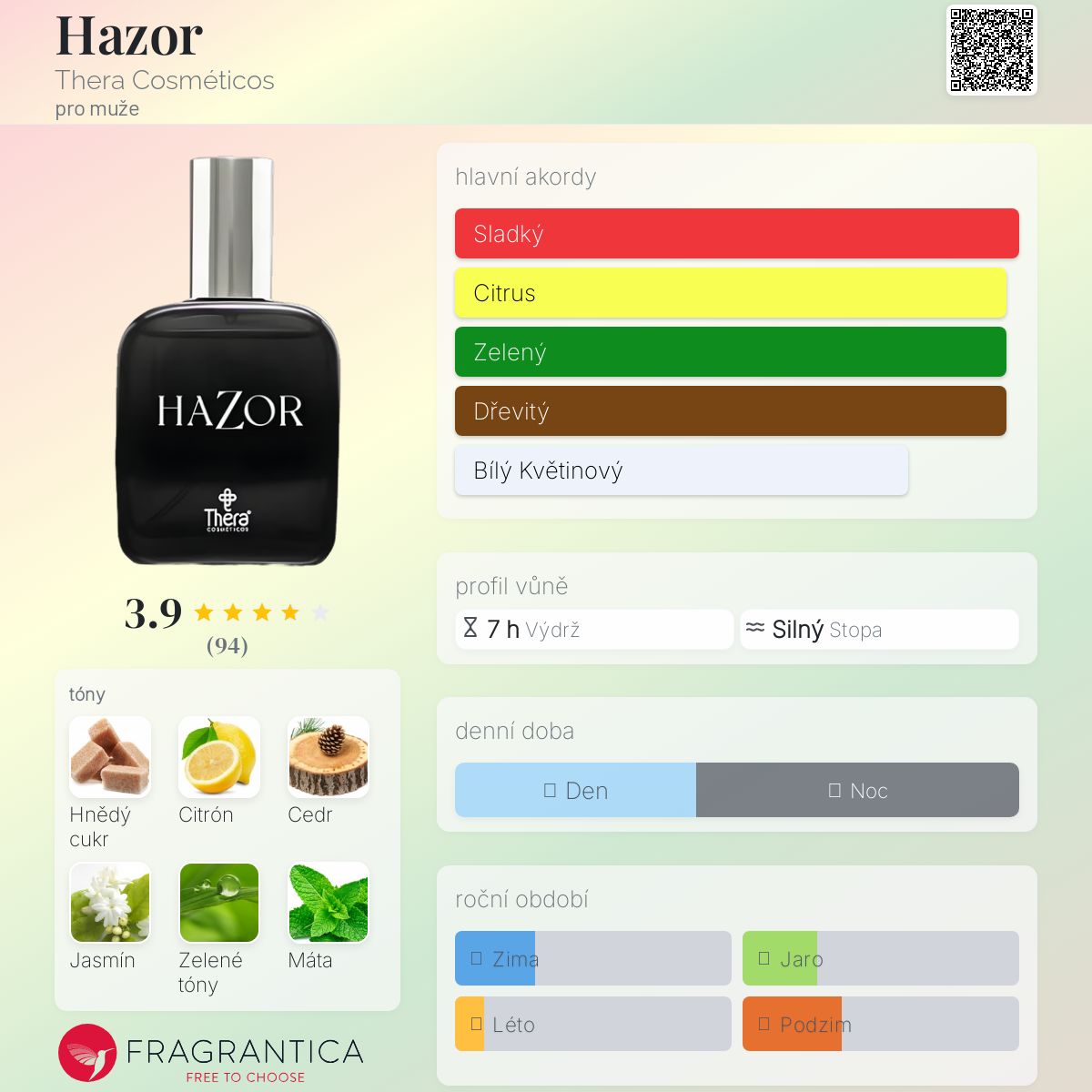 Hazor podle Thera Cosméticos je Orientální Spicy vůně pro muže. Hazor byl/a uveden/a v roce 2017. "Nosem" za touto vůní je Mário Torri Neto. Vrchní tóny jsou Sicilský citron, Zelené listí a Máta; střední tón jeJasmín ; základní tóny jsou Hnědý cukr a Cedr.