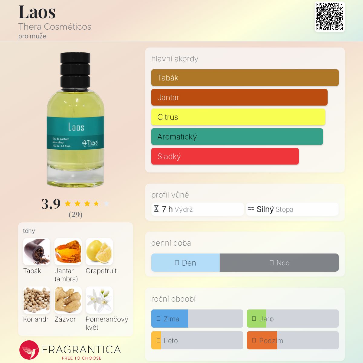 Laos podle Thera Cosméticos je Woody Spicy vůně pro muže. Laos byl/a uveden/a v roce 2018. "Nosem" za touto vůní je Mário Torri Neto. Vrchní tóny jsou Grapefruit, Koriandr a Bazalka; střední tóny jsouZázvor, Pomerančový květ a Kardamom ; základní tóny jsou Tabák, Jantar (ambra) a Cedr.