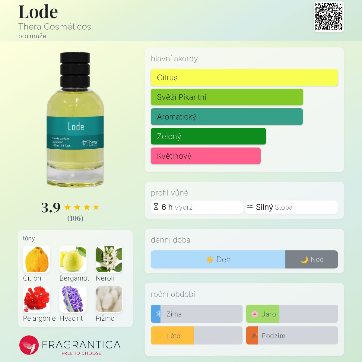Lode podle Thera Cosméticos je Woody Aromatic vůně pro muže. Lode byl/a uveden/a v roce 2017. "Nosem" za touto vůní je Mário Torri Neto. Vrchní tóny jsou Citrón, Bergamot, Neroli a Květ hořkého pomeranče; střední tóny jsouPelargónie, Modrý hyacint, Šalvěj a Cedr ; základní tóny jsou Pižmo, Fazole tonka a Jantar (ambra).