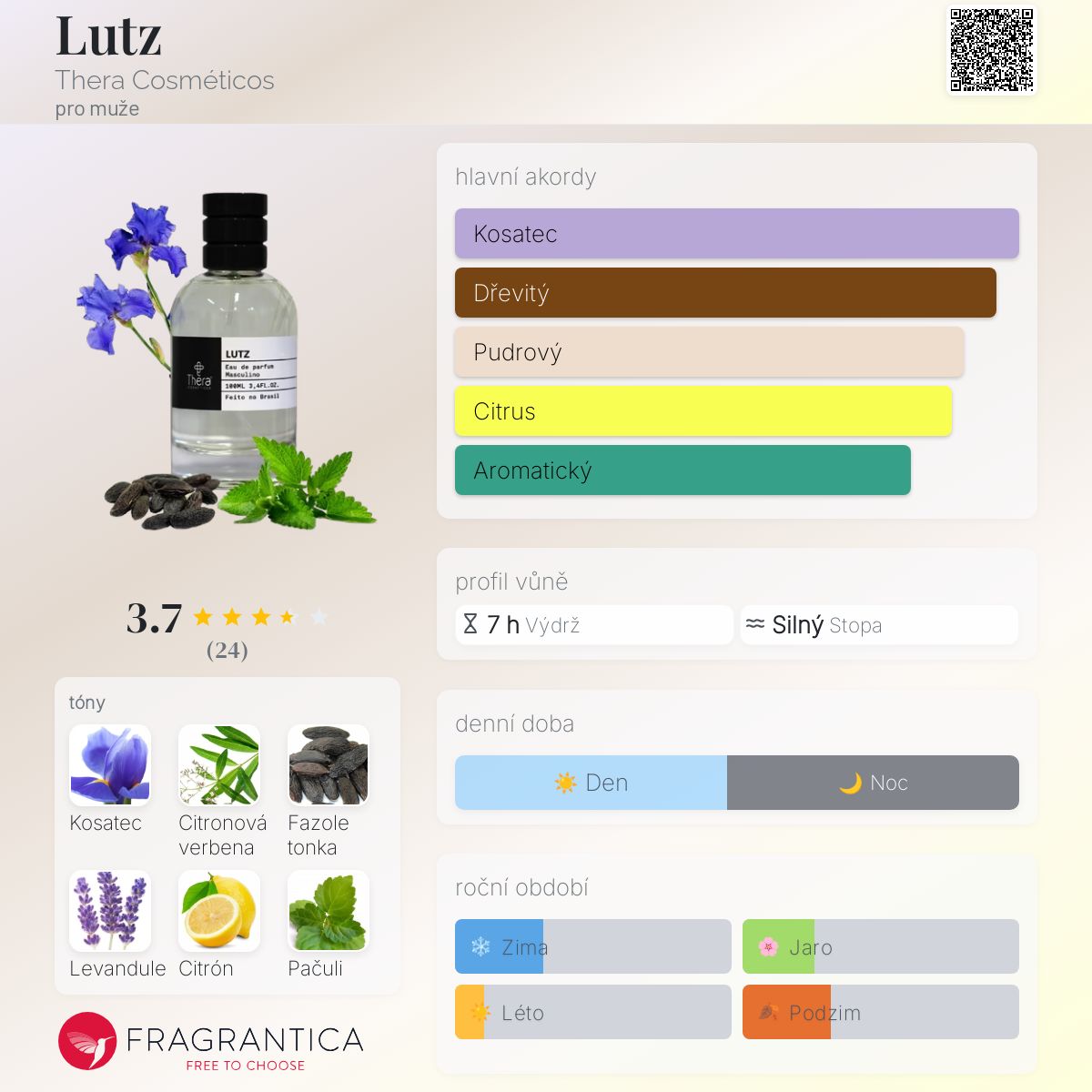 Lutz podle Thera Cosméticos je Orientální Woody vůně pro muže. Lutz byl/a uveden/a v roce 2018. "Nosem" za touto vůní je Mário Torri Neto. Vrchní tóny jsou Sporýš, Levandule a Citrón; střední tóny jsouKosatec, Pačuli, Cedr a Skořice ; základní tóny jsou Fazole tonka, Vanilka, Jantar (ambra), Vetiver a Pižmo.