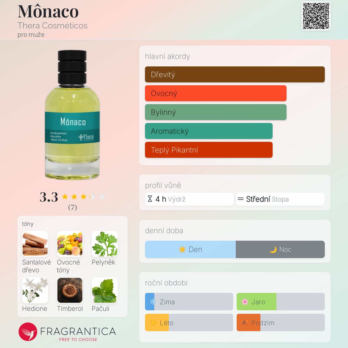 Mônaco podle Thera Cosméticos je Woody Aromatic vůně pro muže. Mônaco byl/a uveden/a v roce 2018. "Nosem" za touto vůní je Mário Torri Neto. Vrchní tón je Ovocné tóny ; střední tóny jsouPelyněk a Hedione ; základní tóny jsou Santalové dřevo, Timberol, Pačuli a Fazole tonka.