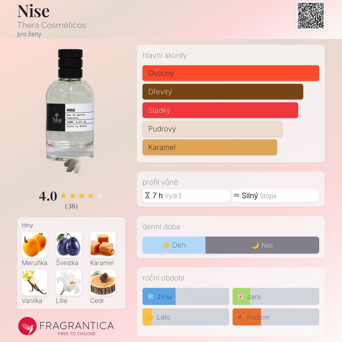 Nise podle Thera Cosméticos je Floral Fruity vůně pro ženy. Nise byl/a uveden/a v roce 2018. "Nosem" za touto vůní je Mário Torri Neto. Vrchní tóny jsou Meruňka, Švestka, Zelené listí a Bergamot; střední tóny jsouBílá lilie, Cedr, Santalové dřevo a Pivoňka ; základní tóny jsou Karamel, Vanilka, Vetiver a Pižmo.