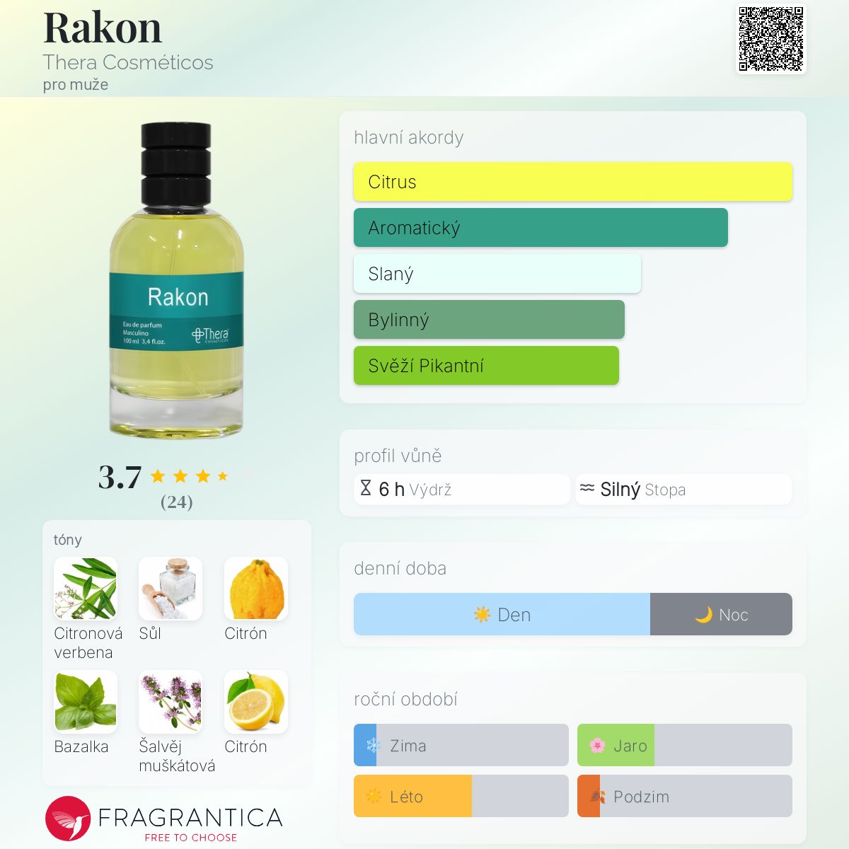 Rakon podle Thera Cosméticos je Aromatic vůně pro muže. Rakon byl/a uveden/a v roce 2019. "Nosem" za touto vůní je Mário Torri Neto. Vrchní tóny jsou Zedrát, Sicilský citron a Bergamot; střední tóny jsouSporýš, Bazalka, Šalvěj muškátová, Šalvěj a Jalovec ; základní tóny jsou Mořská sůl, Jantar (ambra) a Dřevité tóny.