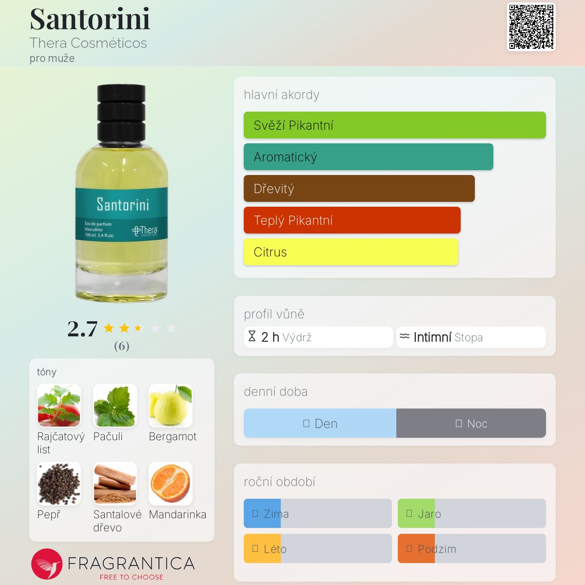 Santorini podle Thera Cosméticos je Woody Aromatic vůně pro muže. Santorini byl/a uveden/a v roce 2017. "Nosem" za touto vůní je Mário Torri Neto. Vrchní tóny jsou Rajčatový list, Bergamot a Mandarinka; střední tóny jsouPepř a Růže ; základní tóny jsou Pačuli a Santalové dřevo.
