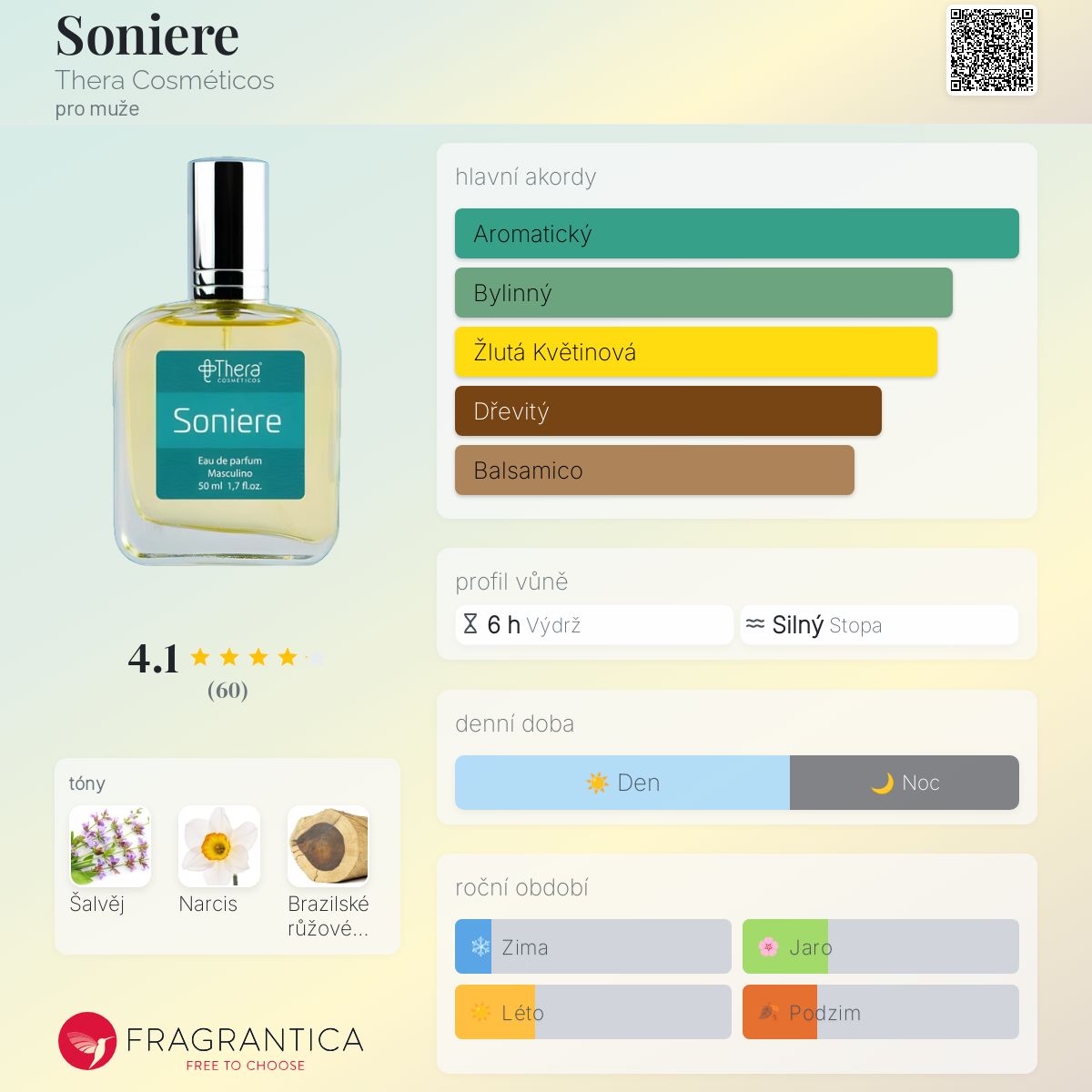 Soniere podle Thera Cosméticos je Aromatic vůně pro muže. Toto je nová vůně. Soniere byl/a uveden/a v roce 2022. "Nosem" za touto vůní je Mário Torri Neto. Vrchní tón je Šalvěj ; střední tón jeBrazilské růžové dřevo ; základní tón je Narcis.
