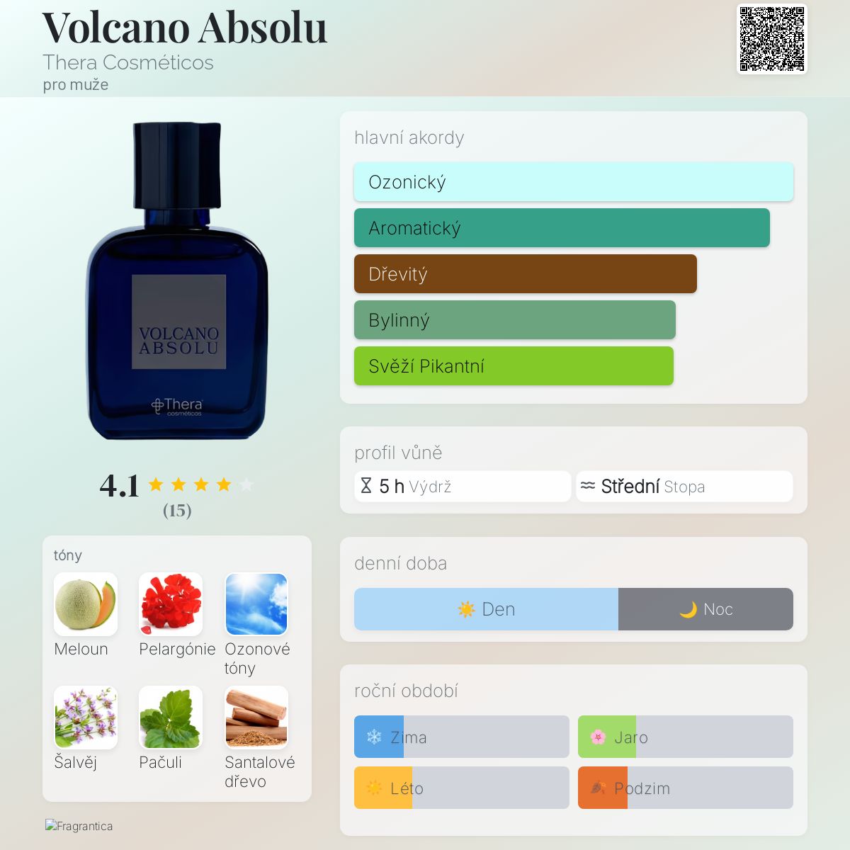 Volcano Absolu podle Thera Cosméticos je Aromatic Fougere vůně pro muže. Toto je nová vůně. Volcano Absolu byl/a uveden/a v roce 2025. Vrchní tóny jsou Meloun, Mandarinka a Citrón; střední tóny jsouPelargónie, Ozonové tóny, Šalvěj a Santalové dřevo ; základní tóny jsou Pačuli, Cedr a Pižmo.
