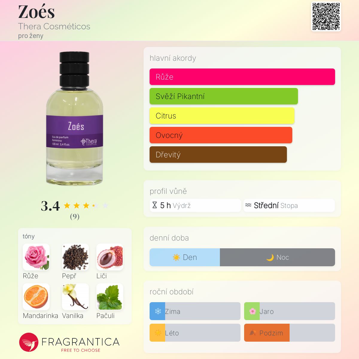 Zoés podle Thera Cosméticos je Orientální Floral vůně pro ženy. Zoés byl/a uveden/a v roce 2019. "Nosem" za touto vůní je Mário Torri Neto. Vrchní tóny jsou Černý pepř, Liči a Mandarinka; střední tóny jsouRůže, Pomerančový květ a Kosatec ; základní tóny jsou Vanilka, Pačuli a Santalové dřevo.