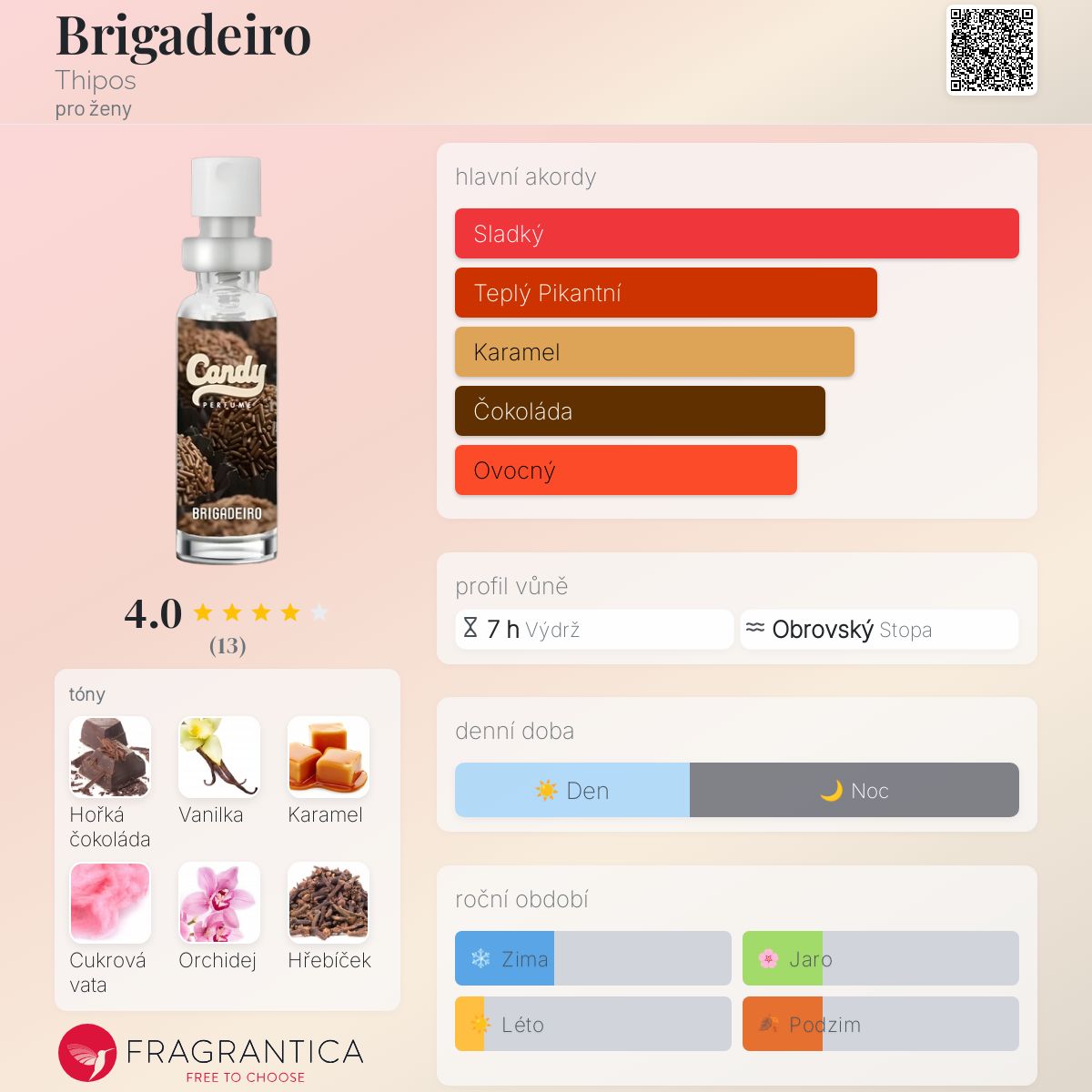 Brigadeiro podle Thipos je Aromatic Fruity vůně pro ženy. Brigadeiro byl/a uveden/a v roce 2022. Vrchní tóny jsou Broskev, Banán, Jablko a Červené ovoce; střední tóny jsouOrchidej, Růže, Jahoda a Pomerančový květ ; základní tóny jsou Čokoláda, Vanilka, Karamel, Cukrová vata, Hřebíček a Pačuli.