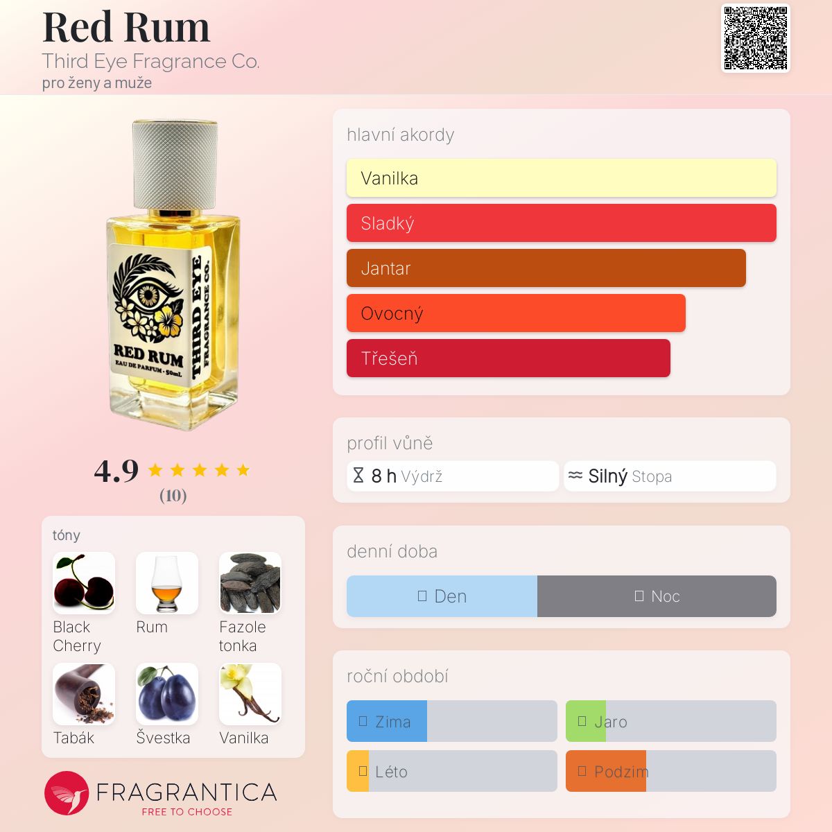 Red Rum podle Third Eye Fragrance Co. je Orientální Vanilla vůně pro ženy a muže. Toto je nová vůně. Red Rum byl/a uveden/a v roce 2025. Vrchní tóny jsou Černá třešeň, Rum a Davana; střední tóny jsouFazole tonka, Tabák a Švestka ; základní tóny jsou Vanilka, Jantar (ambra) a Dub.