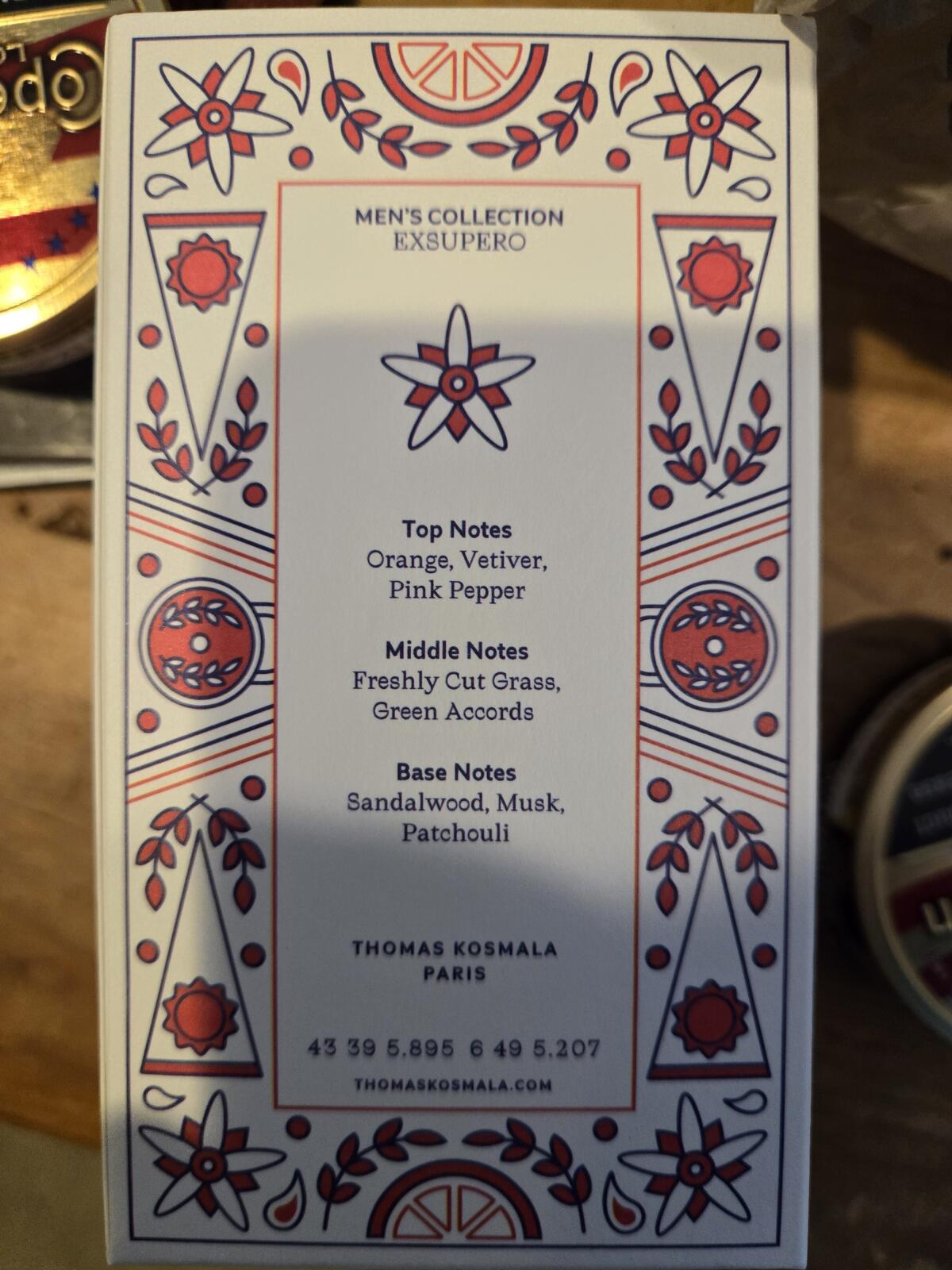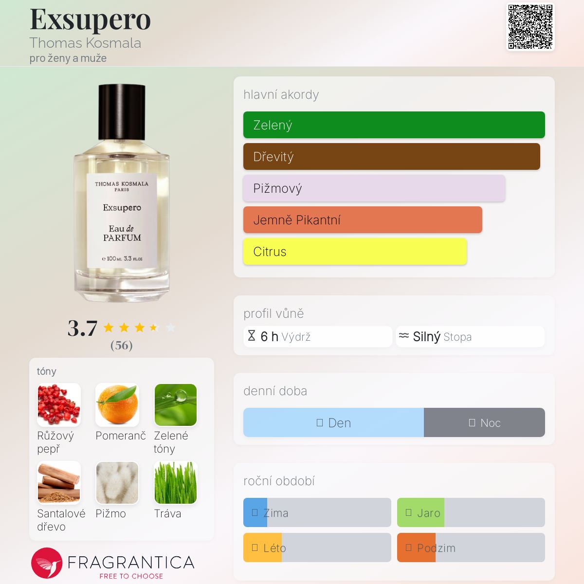 Exsupero podle Thomas Kosmala je Aromatic vůně pro ženy a muže. Toto je nová vůně. Exsupero byl/a uveden/a v roce 2024. "Nosem" za touto vůní je Thomas Kosmala. Vrchní tóny jsou Růžový pepř, Pomeranč a Vetiver; střední tóny jsouZelené tóny a Tráva ; základní tóny jsou Santalové dřevo, Pižmo a Pačuli.