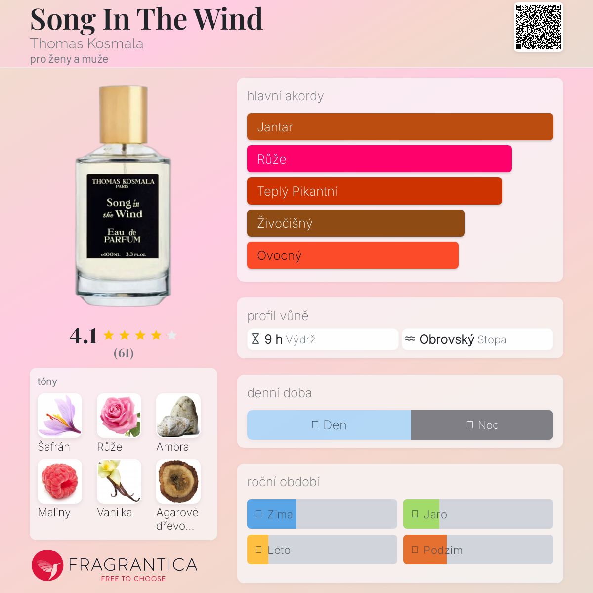 Song In The Wind podle Thomas Kosmala je vůně pro ženy a muže. Song In The Wind byl/a uveden/a v roce 2021. Vrchní tóny jsou Šafrán, Maliny a Bergamot; střední tóny jsouRůže, Vanilka a Pižmo ; základní tóny jsou Ambra, Agarové dřevo (oud), Jantar (ambra) a Pačuli.