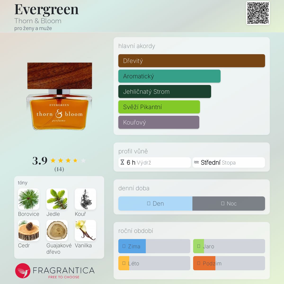 Evergreen podle Thorn & Bloom je Woody vůně pro ženy a muže. Evergreen byl/a uveden/a v roce 2015. "Nosem" za touto vůní je Jennifer Botto. Vrchní tóny jsou Jehličí borovice a Jedle; střední tóny jsouCedr a Guajakové dřevo ; základní tóny jsou Kouř, Vanilka, Agarové dřevo (oud) a Dubový mech.