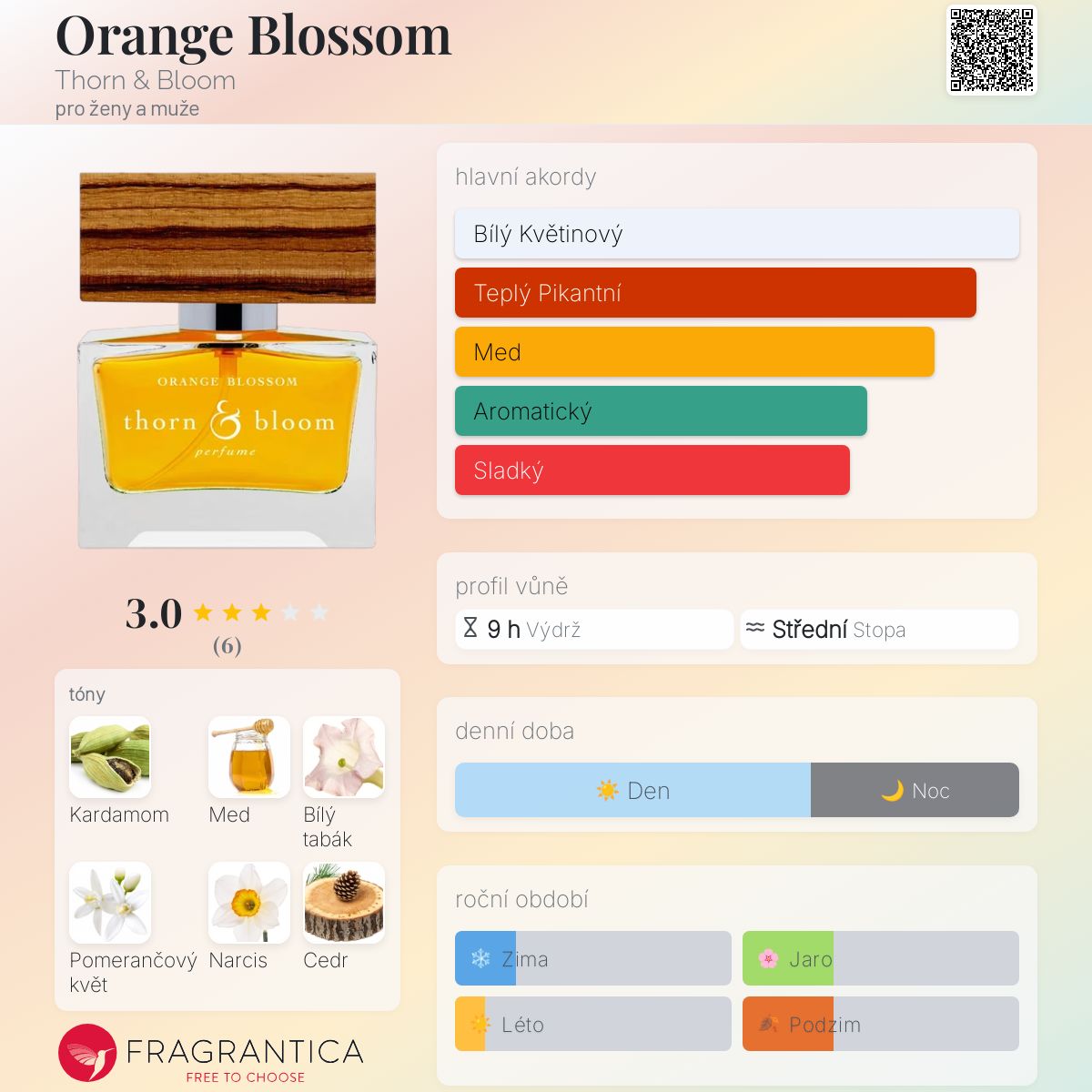 Orange Blossom podle Thorn & Bloom je Orientální Floral vůně pro ženy a muže. Orange Blossom byl/a uveden/a v roce 2015. "Nosem" za touto vůní je Jennifer Botto. Vrchní tóny jsou Kardamom a Med; střední tóny jsouPomerančový květ a Narcis ; základní tóny jsou Bílý tabák, Cedr, Seno, Dub a Pačuli.