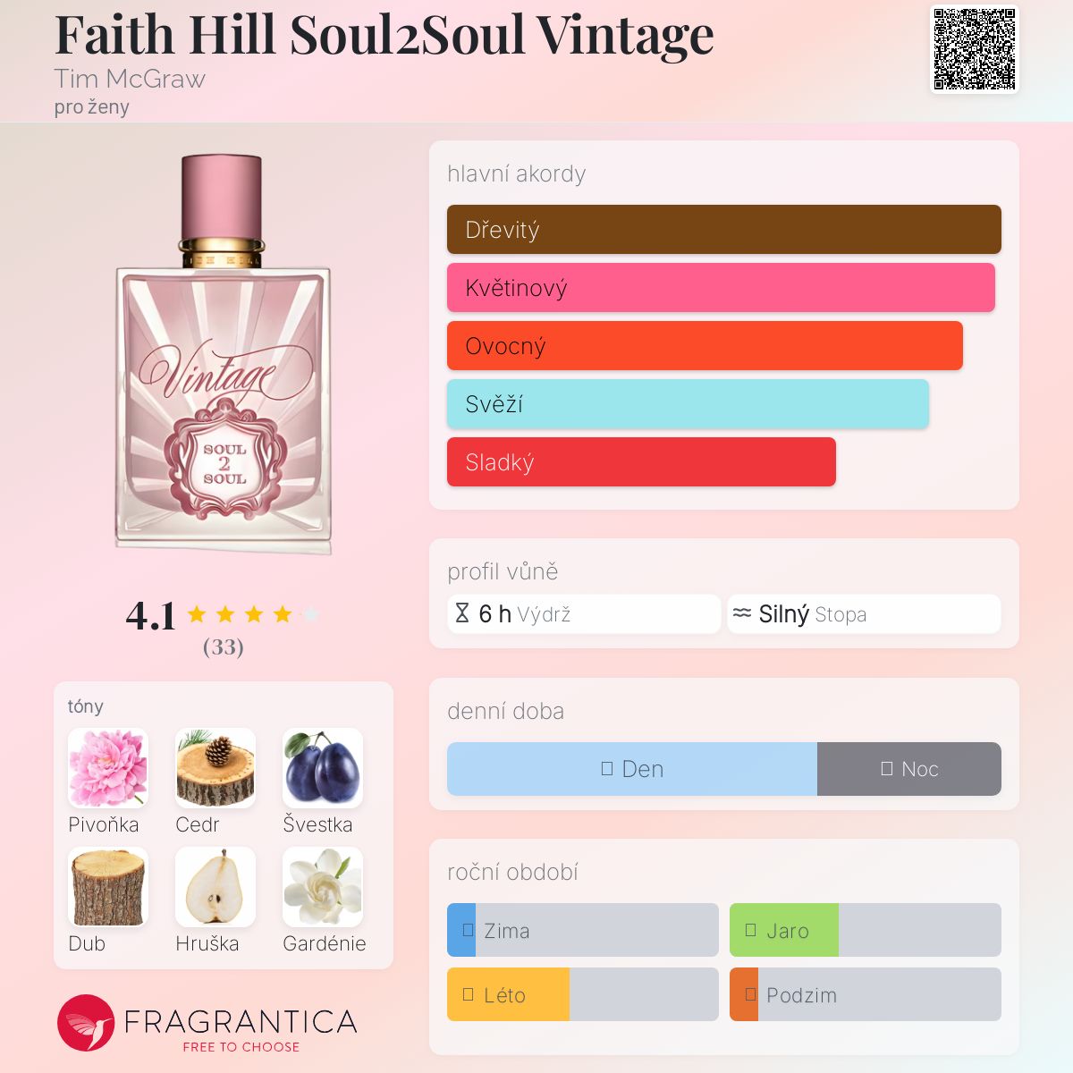 Faith Hill Soul2Soul Vintage podle Tim McGraw je Floral Fruity vůně pro ženy. Faith Hill Soul2Soul Vintage byl/a uveden/a v roce 2013. Vrchní tóny jsou Švestka, Hruška a Mučenka; střední tóny jsouPivoňka, Gardénie a Pelargónie ; základní tóny jsou Virginský cedr a Dub.