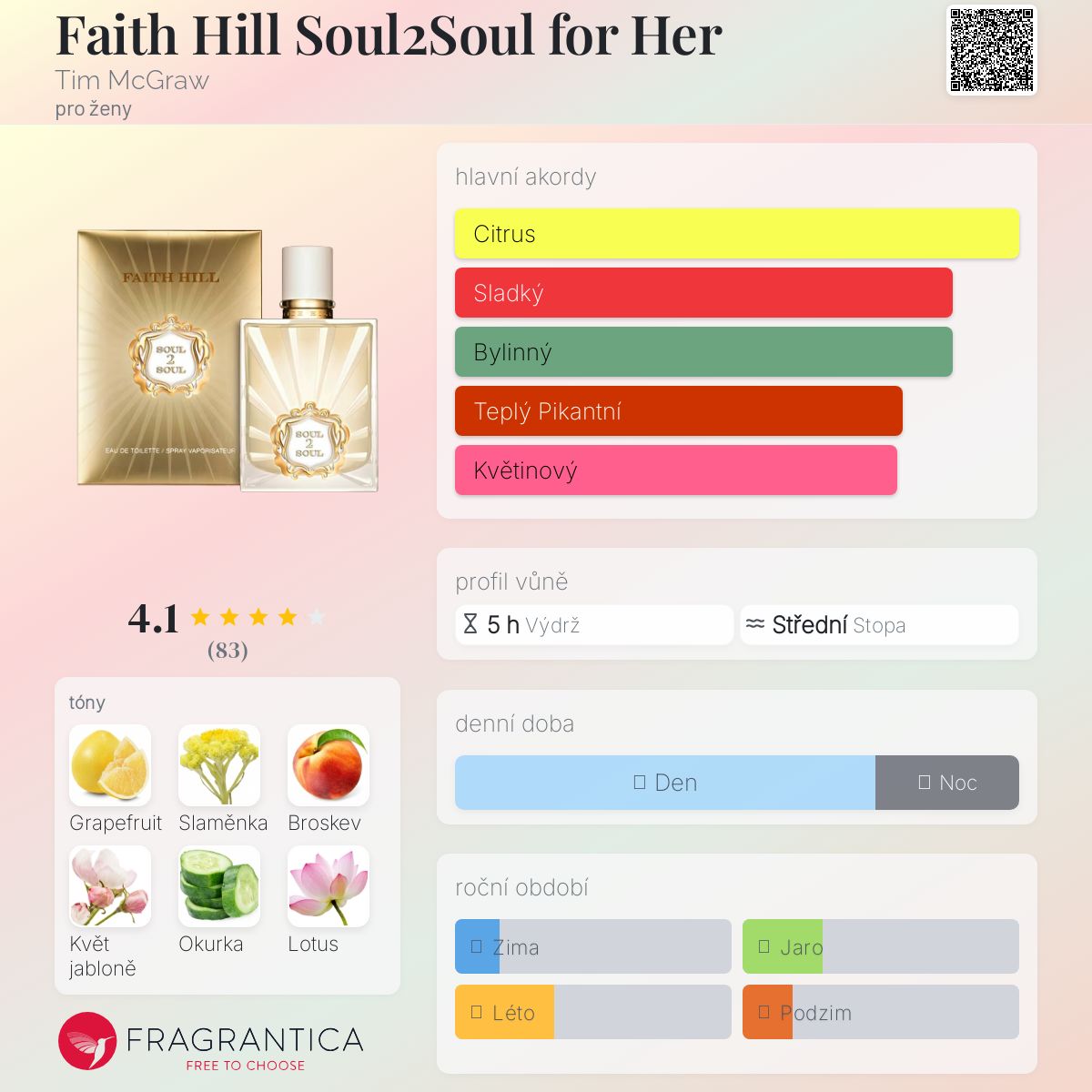 Faith Hill Soul2Soul for Her podle Tim McGraw je Floral Fruity vůně pro ženy. Faith Hill Soul2Soul for Her byl/a uveden/a v roce 2012. Vrchní tóny jsou Grapefruit, Bílá broskev a Květ jabloně; střední tóny jsouSlaměnka, Lotus a Růže ; základní tóny jsou Okurka, Santalové dřevo a Mech.