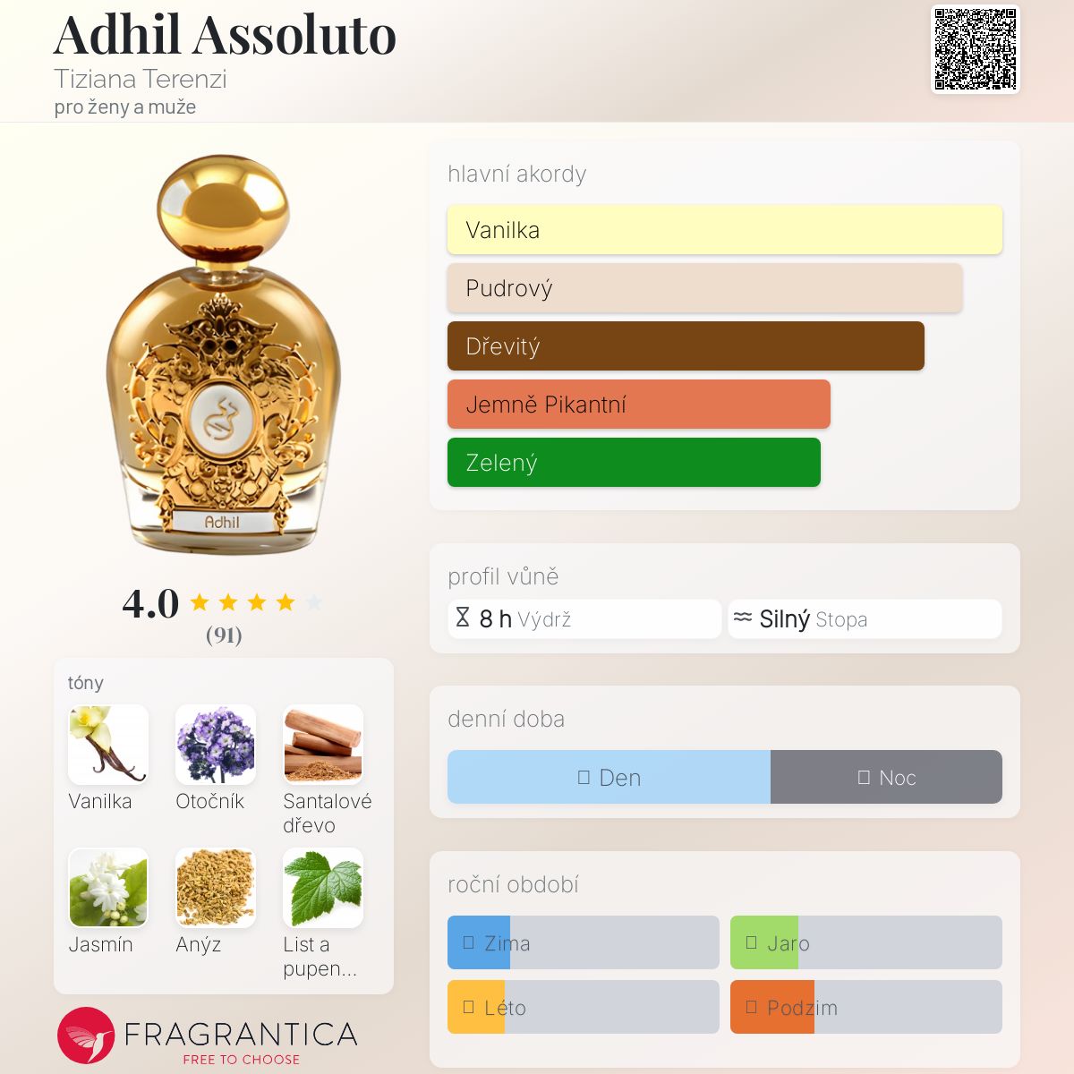 Adhil Assoluto podle Tiziana Terenzi je Floral Green vůně pro ženy a muže. Adhil Assoluto byl/a uveden/a v roce 2016. "Nosem" za touto vůní je Paolo Terenzi. Vrchní tóny jsou Anýz, Černý rybíz a Zelené tóny; střední tóny jsouJasmín a Ozonové tóny ; základní tóny jsou Vanilka, Otočník, Australské santalové dřevo, Jantar (ambra), Amyris a Dubový mech.