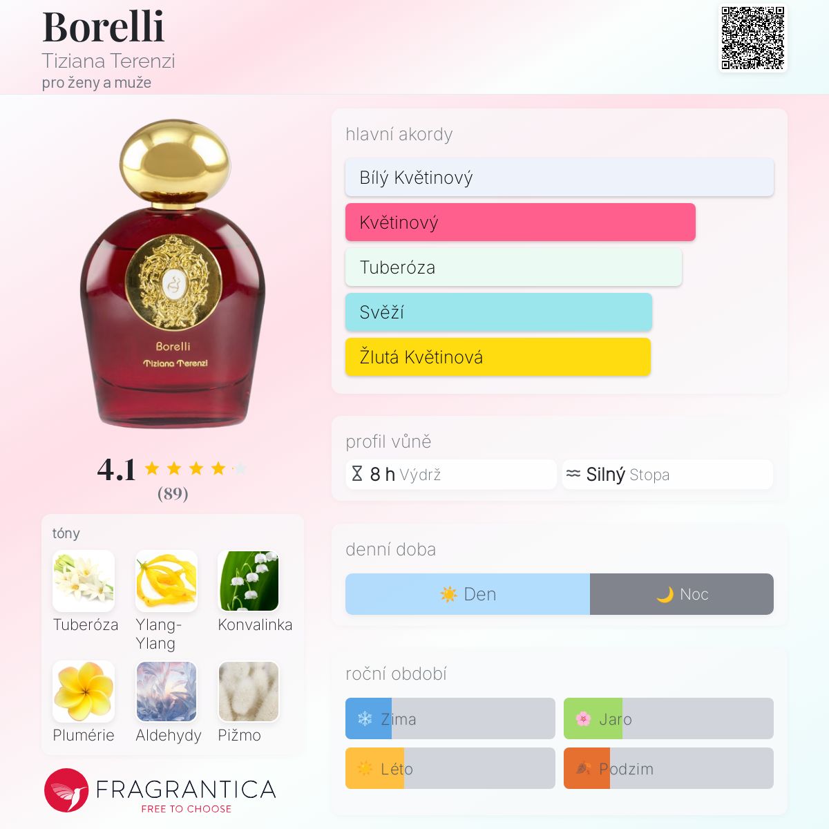 Borelli podle Tiziana Terenzi je vůně pro ženy a muže. Borelli byl/a uveden/a v roce 2023. "Nosem" za touto vůní je Paolo Terenzi. Vrchní tóny jsou Plumérie, Aldehydy, Kalábrijský bergamot a Sicilská mandarinka; střední tóny jsouTuberóza, Ylang-Ylang, Konvalinka, Italská fialka a Bulharská růže ; základní tóny jsou Pižmo, Madagaskarská vanilka, Eben, Australské santalové dřevo a Bříza.