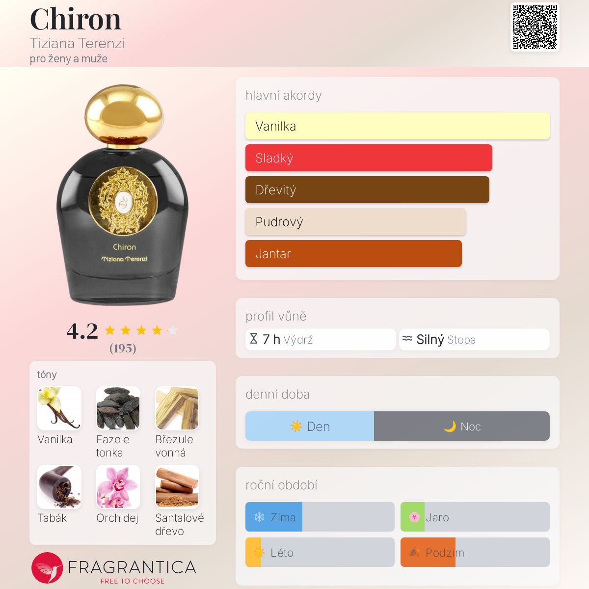 Chiron podle Tiziana Terenzi je Woody vůně pro ženy a muže. Chiron byl/a uveden/a v roce 2021. "Nosem" za touto vůní je Paolo Terenzi. Vrchní tóny jsou Fazole tonka, Vanilková orchidej a Pižmo; střední tóny jsouTabák a Ambra ; základní tóny jsou Bourbonská vanilka, Palo Santo, Santalové dřevo a Bílý oud.