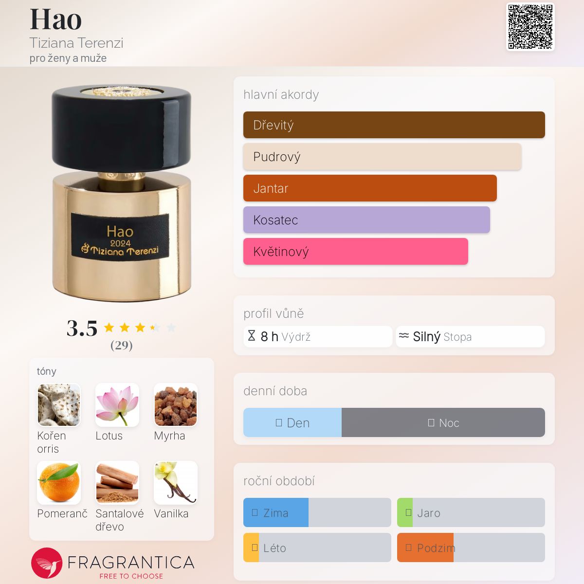 Hao podle Tiziana Terenzi je Orientální Woody vůně pro ženy a muže. Toto je nová vůně. Hao byl/a uveden/a v roce 2024. "Nosem" za touto vůní je Paolo Terenzi. Vrchní tóny jsou Orris, Lotus a Sicilský pomeranč; střední tóny jsouAustralské santalové dřevo, Madagaskarská vanilka, Karamel a Ambra ; základní tóny jsou Myrha, Bílý oud, Kambodžský oud, Kadidlo, Pižmo a Cedr.
