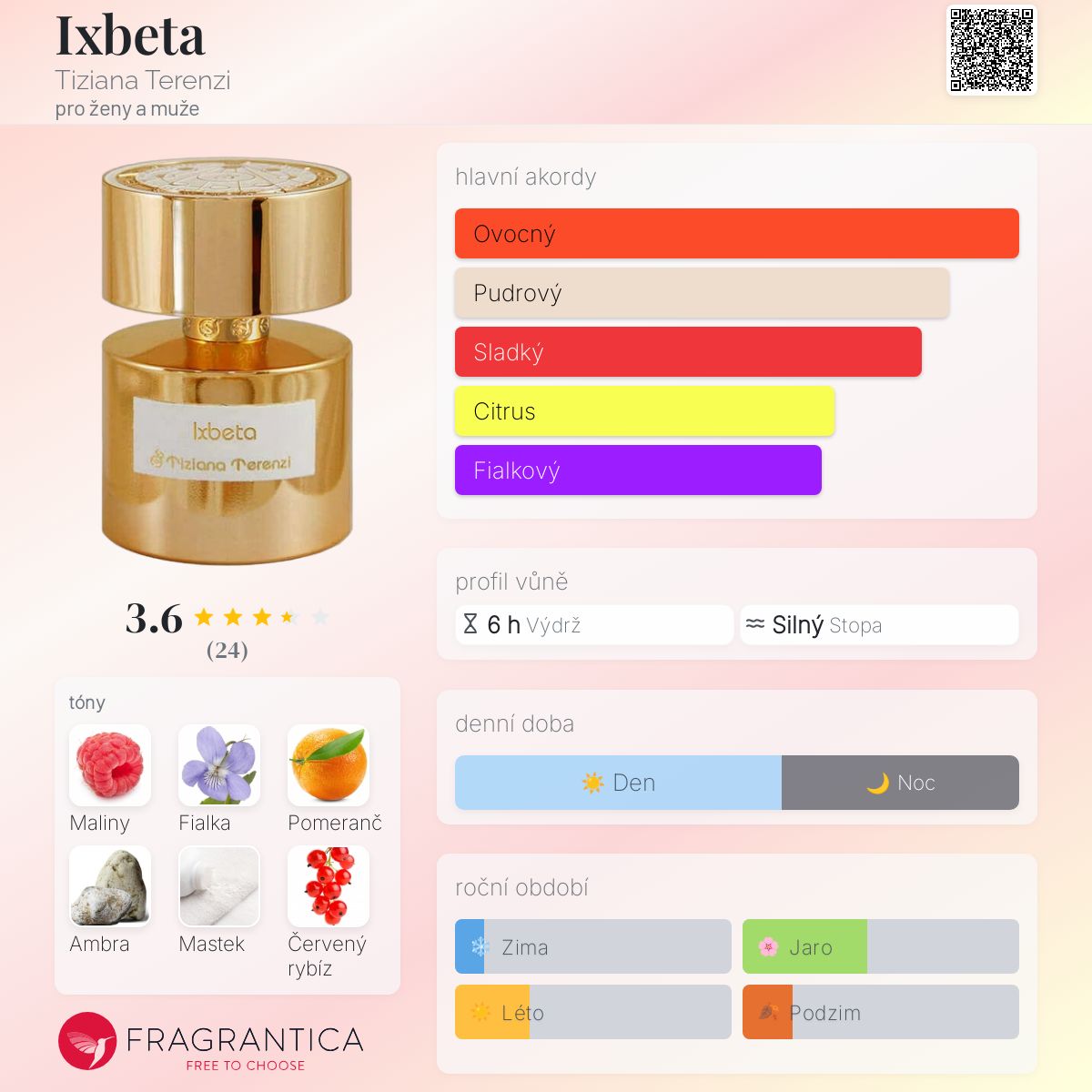 Ixbeta podle Tiziana Terenzi je Floral Fruity vůně pro ženy a muže. Toto je nová vůně. Ixbeta byl/a uveden/a v roce 2024. "Nosem" za touto vůní je Paolo Terenzi. Vrchní tóny jsou Sicilský pomeranč, Červený rybíz, Kardamom, Kalábrijský bergamot a Citrón; střední tóny jsouMaliny, Italská fialka, Broskev, Africká pelargonie, Bulharská růže, Růžový pepř, Vonokvětka a Indický jasmín ; základní tóny jsou Ambra, Mastek, Dubový mech, Pižmo, Australské santalové dřevo a Kambodžský oud.