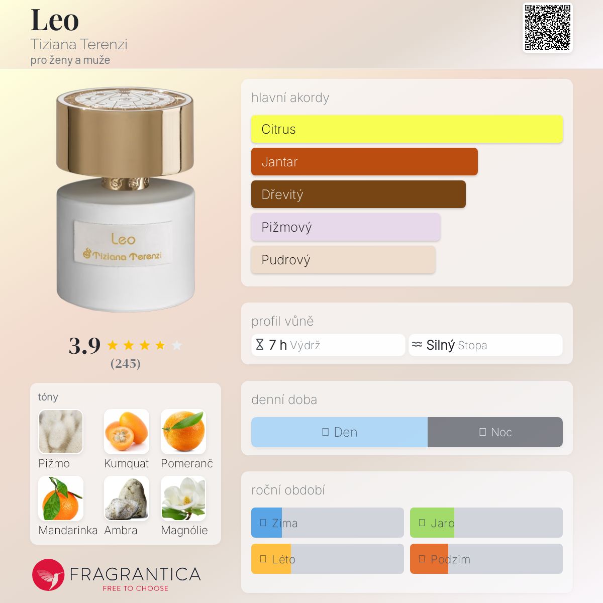 Leo podle Tiziana Terenzi je vůně pro ženy a muže. Leo byl/a uveden/a v roce 2022. "Nosem" za touto vůní je Paolo Terenzi. Vrchní tóny jsou Kumquat, Brazilský pomeranč, Sicilská mandarinka a Kalábrijský bergamot; střední tóny jsouAmbra, Magnólie, Fialkové listy, Myrha, Jasmín Sambac a Bulharská růže ; základní tóny jsou Pižmo, Australské santalové dřevo, Cedr, Fazole tonka, Siamský (thajský) benzoin a Dub.