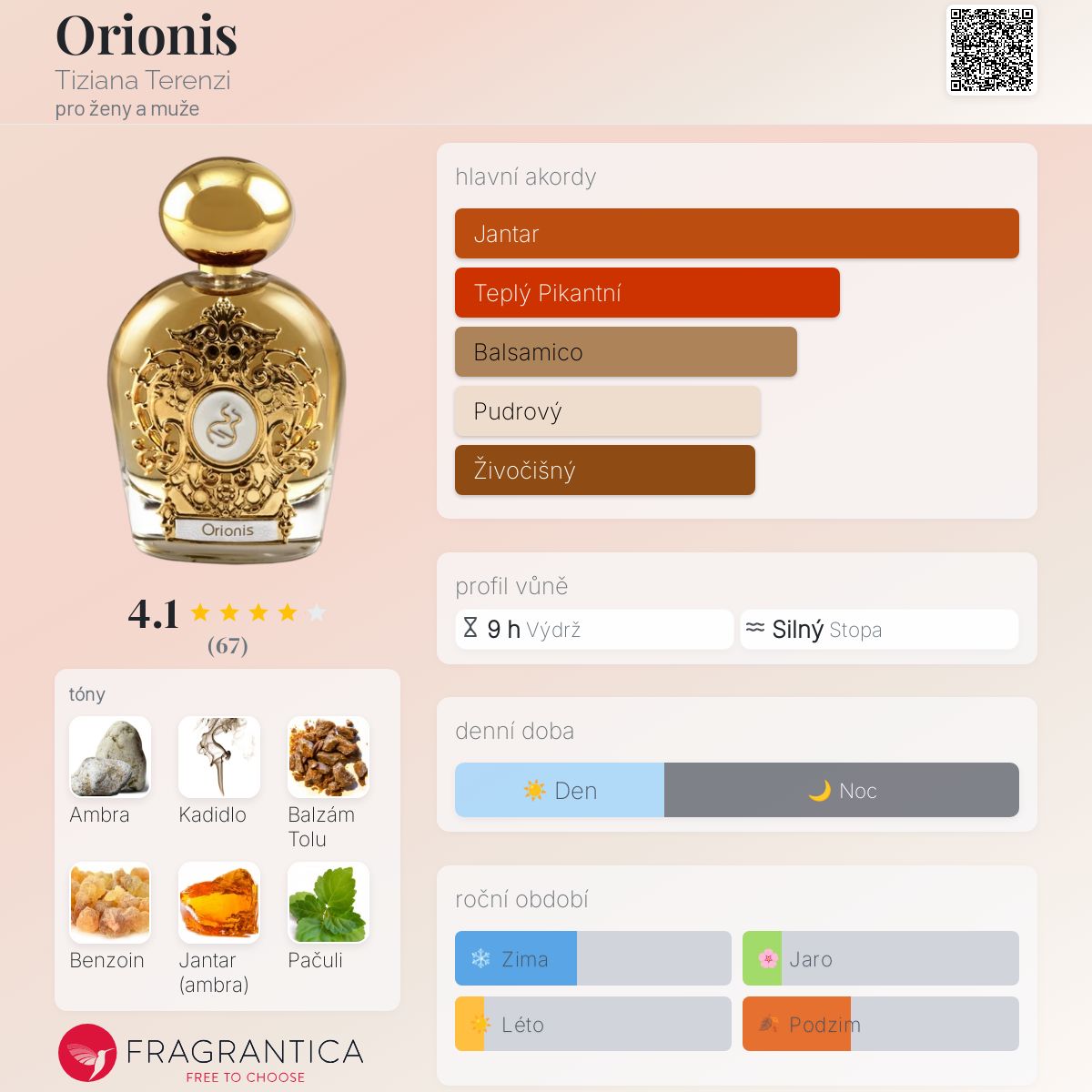 Orionis podle Tiziana Terenzi je Orientální vůně pro ženy a muže. Orionis byl/a uveden/a v roce 2019. "Nosem" za touto vůní je Paolo Terenzi. Vrchní tóny jsou Kadidlo a Šafrán; střední tóny jsouAmbra, Jantar (ambra) a Pačuli ; základní tóny jsou Balzám Tolu, Benzoin, Pižmo a Vanilka.