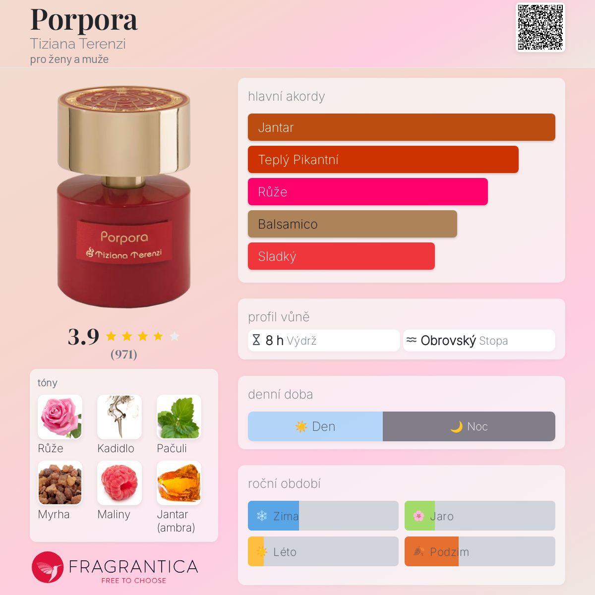 Porpora podle Tiziana Terenzi je Orientální Floral vůně pro ženy a muže. Porpora byl/a uveden/a v roce 2017. "Nosem" za touto vůní je Paolo Terenzi. Vrchní tóny jsou Růže, Maliny, Hřebíček a Skořice; střední tóny jsouBulharská růže, Kadidlo, Pačuli a Mák ; základní tóny jsou Myrha, Jantar (ambra), Pižmo, Benzoin a Kaštan.