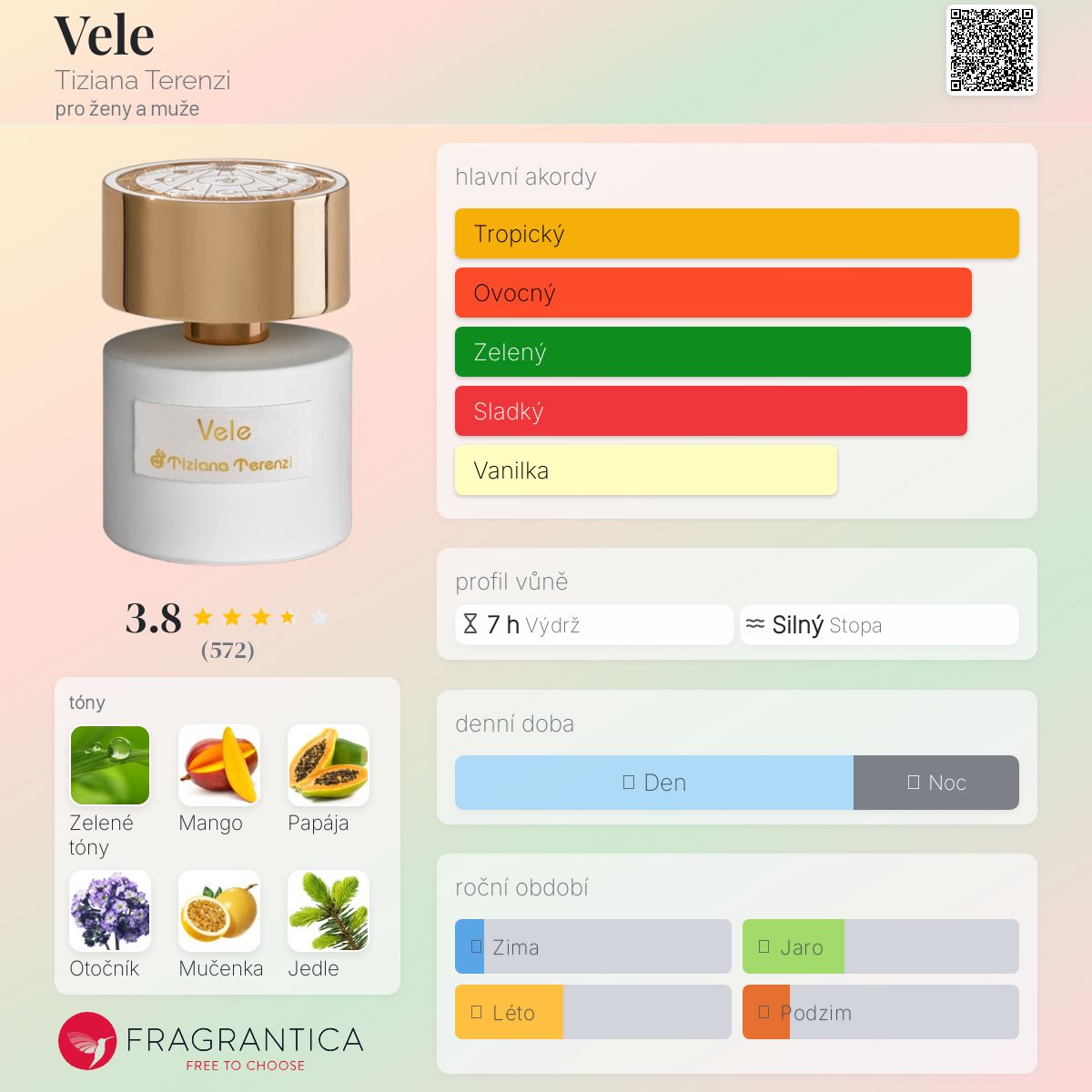 Vele podle Tiziana Terenzi je Floral Fruity vůně pro ženy a muže. Vele byl/a uveden/a v roce 2017. "Nosem" za touto vůní je Paolo Terenzi. Vrchní tóny jsou Zelené listí, Mango, Mučenka, Jedle a Červený rybíz; střední tóny jsouOtočník, Hyacint, Ylang-Ylang, Umbu-Cajá | Taperebá, Jasmín a Růže ; základní tóny jsou Papája, Vanilka, Pižmo, Pavlovnie, Jantar (ambra) a Nové koření.