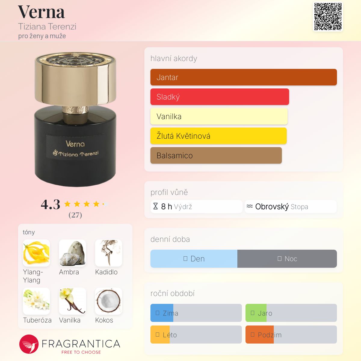 Verna podle Tiziana Terenzi je Orientální Floral vůně pro ženy a muže. Toto je nová vůně. Verna byl/a uveden/a v roce 2025. "Nosem" za touto vůní je Paolo Terenzi. Vrchní tóny jsou Bulharská růže, Šafrán a Růžový pepř; střední tóny jsouYlang-Ylang, Tuberóza, Kadidlo, Ambra, Kokos, Broskev, Indický jasmín, Cedr a Kůže ; základní tóny jsou Madagaskarská vanilka, Ambra, Pižmo, Kumarin, Kapradina a Fenykl.