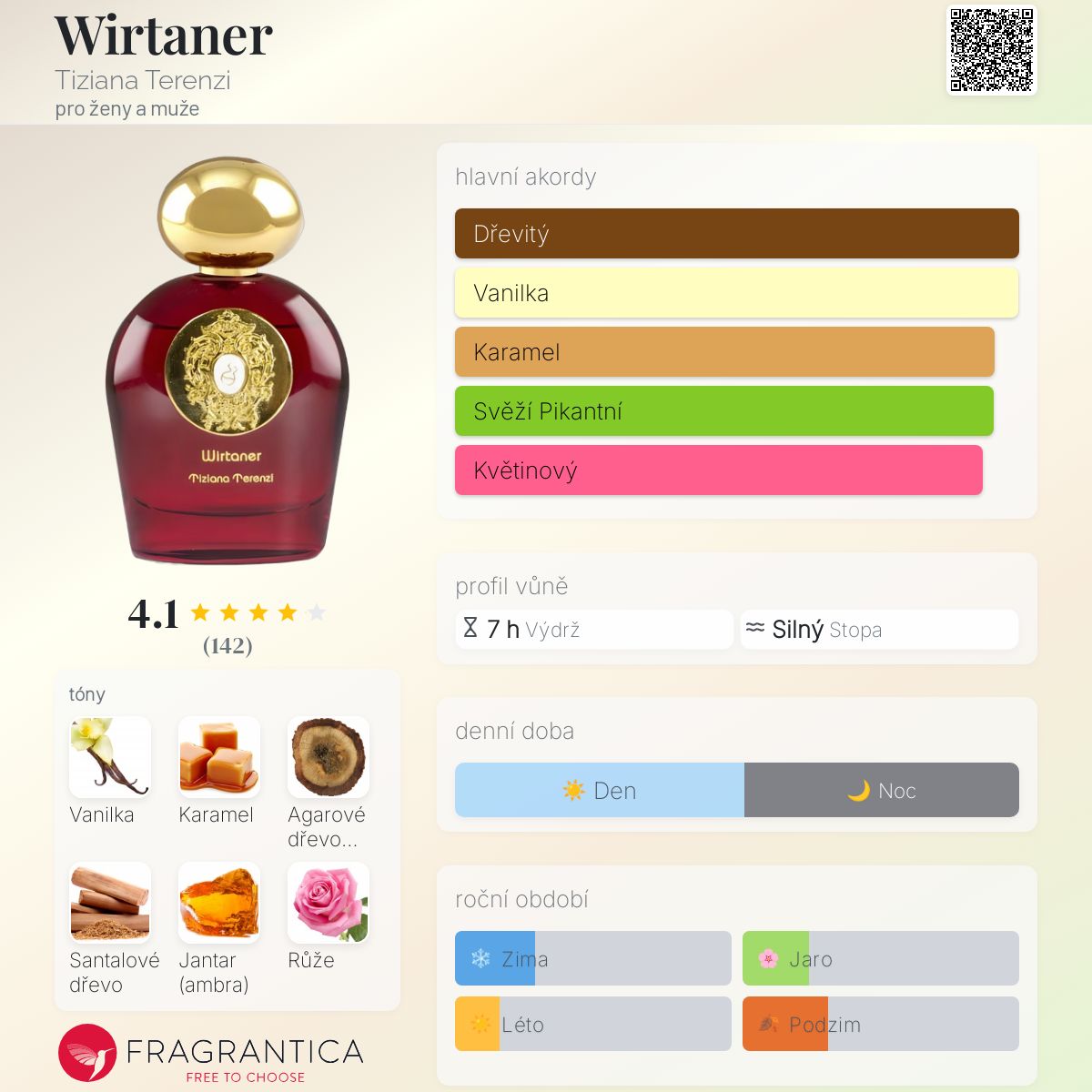 Wirtaner podle Tiziana Terenzi je Woody Floral Musk vůně pro ženy a muže. Wirtaner byl/a uveden/a v roce 2019. "Nosem" za touto vůní je Paolo Terenzi. Vrchní tóny jsou Růže, Bergamot a Ylang-Ylang; střední tóny jsouAgarové dřevo (oud), Pivoňka, Pepř a Jasmín ; základní tóny jsou Vanilka, Karamel, Santalové dřevo a Jantar (ambra).