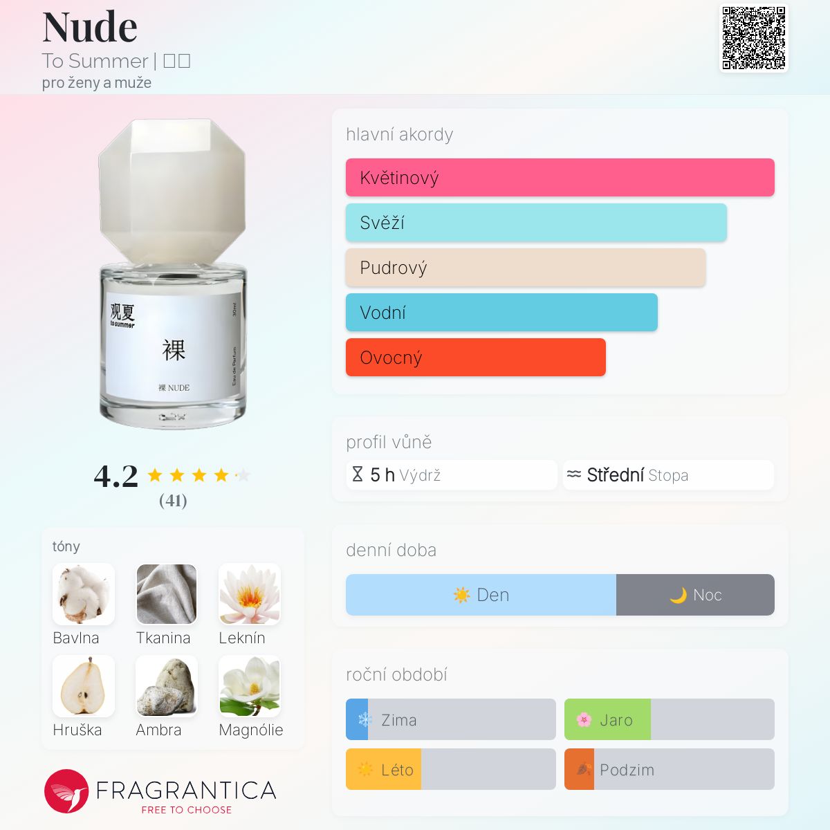 Nude 裸 podle To Summer | 观夏 je Floral vůně pro ženy a muže. Nude 裸 byl/a uveden/a v roce 2021. "Nosem" za touto vůní je Jérôme Epinette. Vrchní tóny jsou Bavlna, Hruška a Bergamot; střední tóny jsouLeknín, Magnólie a Fialka ; základní tóny jsou Tkanina, Ambra a Jantar (ambra).