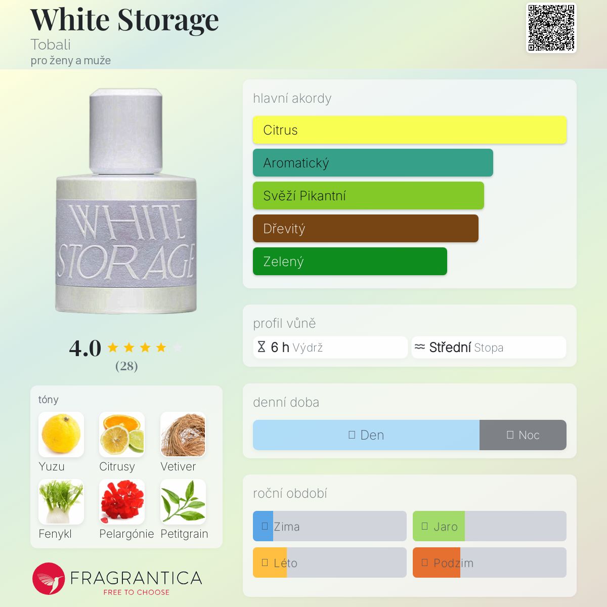White Storage podle Tobali je Woody Aromatic vůně pro ženy a muže. White Storage byl/a uveden/a v roce 2018. Vrchní tóny jsou Yuzu, Hřebíček, Šafrán a Růžový pepř; střední tóny jsouFenykl, Pelargónie, Petitgrain, Kadidlo a Agarové dřevo (oud) ; základní tóny jsou Citrusy, Vetiver, Cedr, Santalové dřevo a Jantar (ambra).