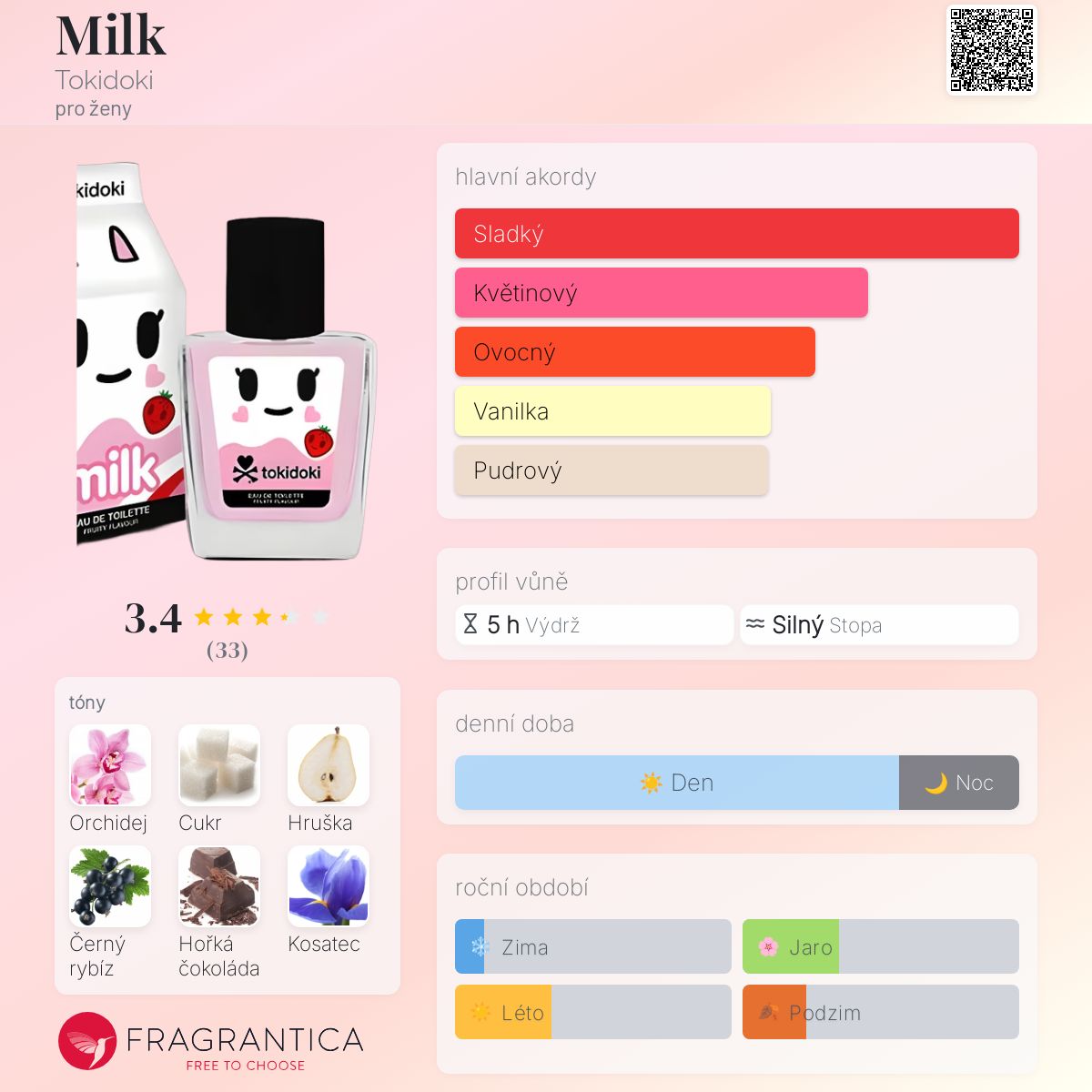 Milk podle Tokidoki je Orientální Vanilla vůně pro ženy. Milk byl/a uveden/a v roce 2016. Vrchní tóny jsou Orchidej, Hruška, Černý rybíz a Frézie; střední tóny jsouKosatec, Jasmín, Pačuli a Pomerančový květ ; základní tóny jsou Cukr, Čokoláda, Fazole tonka a Pačuli.