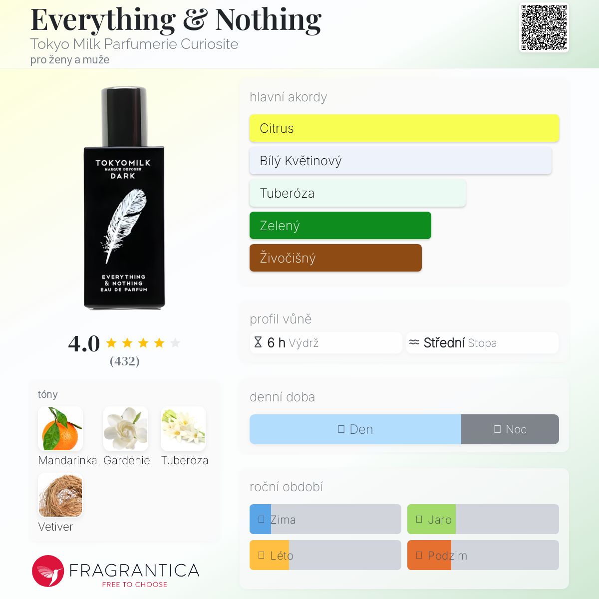Everything & Nothing podle Tokyo Milk Parfumerie Curiosite je Chypre Floral vůně pro ženy a muže. Everything & Nothing byl/a uveden/a v roce 2011. "Nosem" za touto vůní je Margot Elena.
