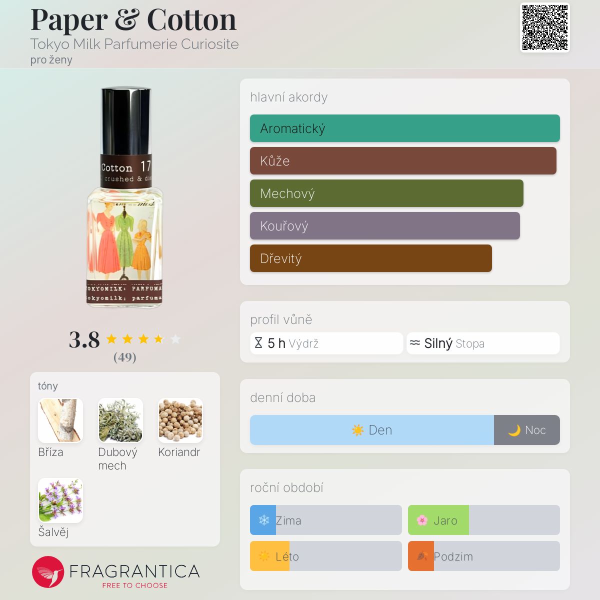 Paper & Cotton podle Tokyo Milk Parfumerie Curiosite je Chypre vůně pro ženy. Paper & Cotton byla spuštěna během 2000. "Nosem" za touto vůní je Margot Elena.