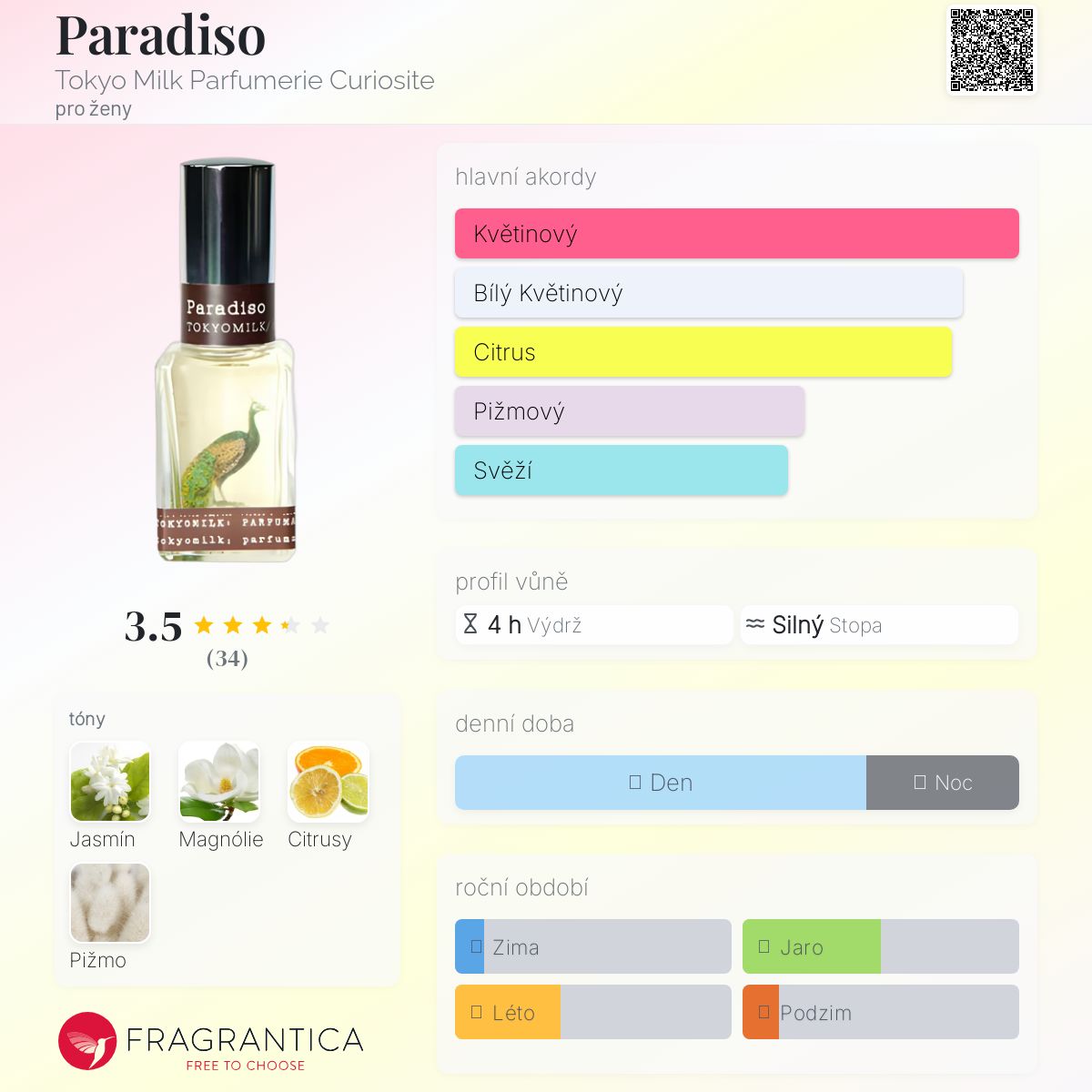 Paradiso podle Tokyo Milk Parfumerie Curiosite je Floral vůně pro ženy. Paradiso byla spuštěna během 2000. "Nosem" za touto vůní je Margot Elena.