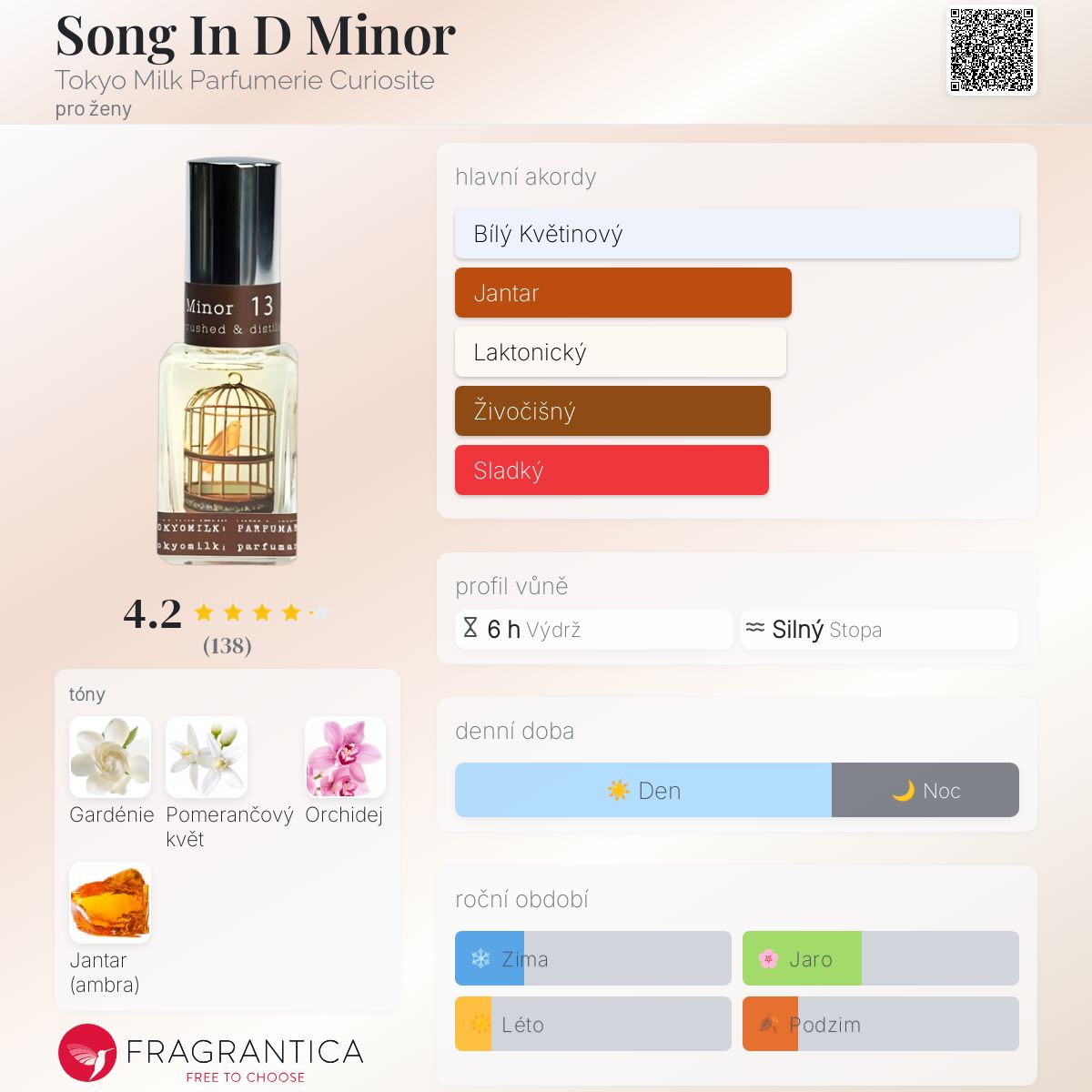 Song In D Minor podle Tokyo Milk Parfumerie Curiosite je Floral vůně pro ženy. Song In D Minor byla spuštěna během 2000. "Nosem" za touto vůní je Margot Elena.