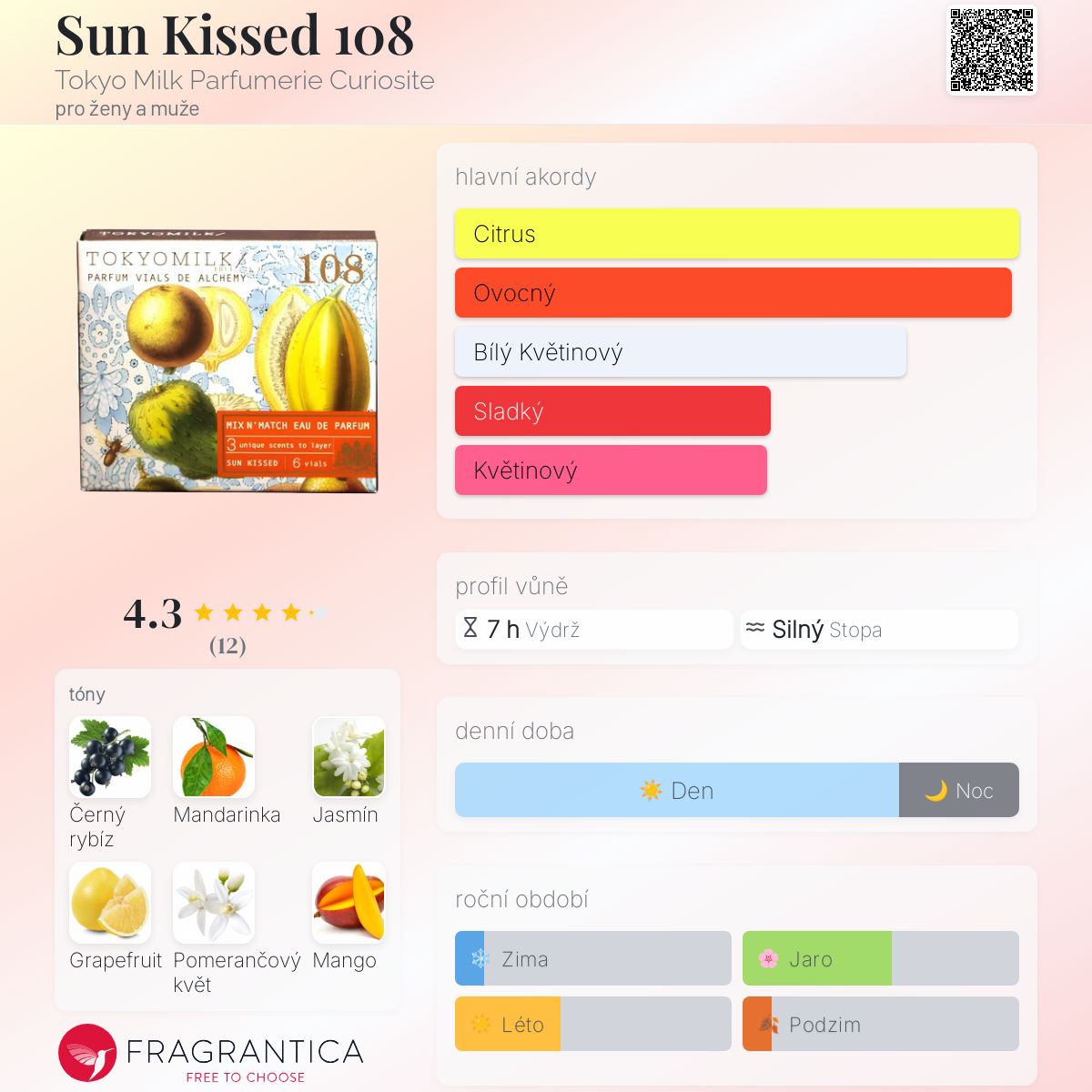 Sun Kissed 108 podle Tokyo Milk Parfumerie Curiosite je Floral Fruity vůně pro ženy a muže. Sun Kissed 108 byl/a uveden/a v roce 2012. "Nosem" za touto vůní je Margot Elena.