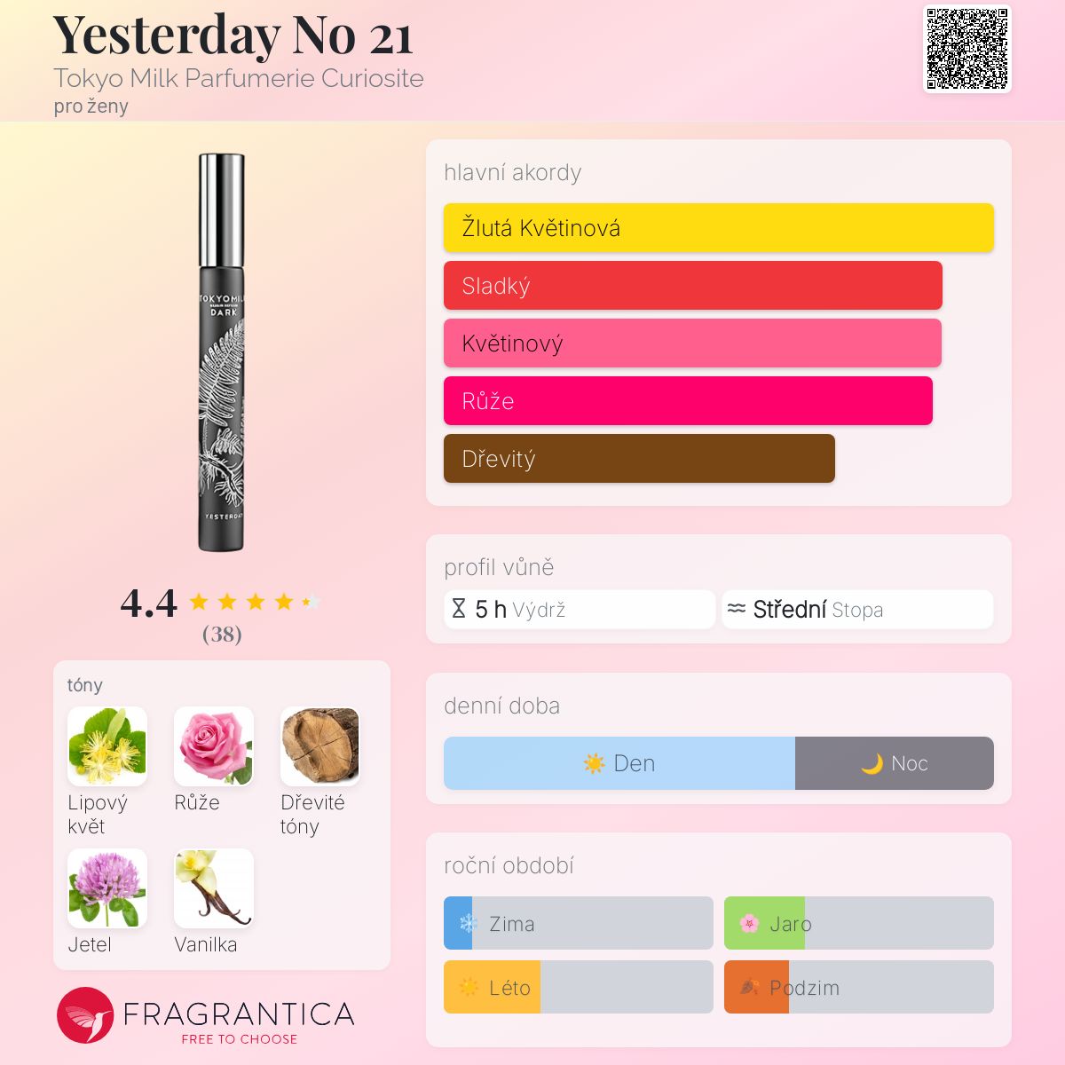 Yesterday No 21 podle Tokyo Milk Parfumerie Curiosite je Floral Fruity Gourmand vůně pro ženy. Yesterday No 21 byl/a uveden/a v roce 2012. "Nosem" za touto vůní je Margot Elena.