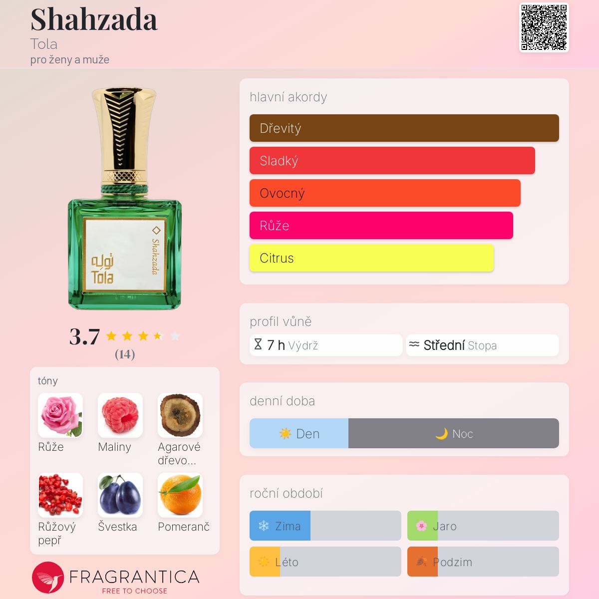 Shahzada podle Tola je Chypre Floral vůně pro ženy a muže. Shahzada byl/a uveden/a v roce 2013. "Nosem" za touto vůní je Dhaher Bin Dhaher. Vrchní tóny jsou Maliny, Růžový pepř, Švestka, Pomeranč, Grapefruit a Limetka; střední tóny jsouRůže, Pelargónie, Konvalinka a Jasmín ; základní tóny jsou Agarové dřevo (oud), Cedr, Guajakové dřevo, Med, Olibanum, Vanilka, Santalové dřevo, Cypriolový olej, Bílé pižmo, Pačuli a Ambra.