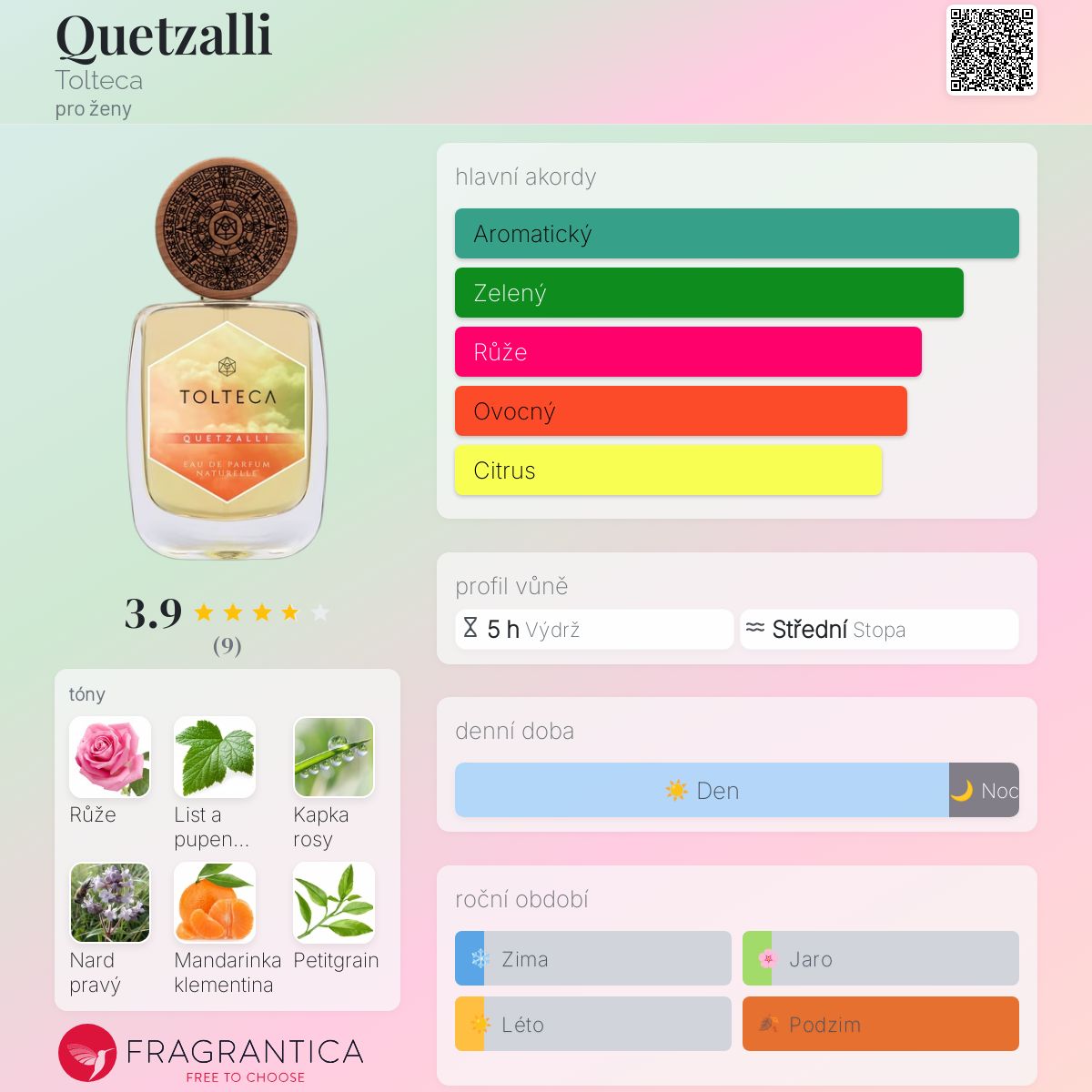 Quetzalli podle Tolteca je vůně pro ženy. Quetzalli byl/a uveden/a v roce 2018. "Nosem" za touto vůní je Stephanie Bakouche. Vrchní tóny jsou Černý rybíz, Mandarinka klementina, Petitgrain a Galbanum; střední tóny jsouRůže, Kapka rosy a Maliny ; základní tóny jsou Nard himálajský, Cedr a Amyris.